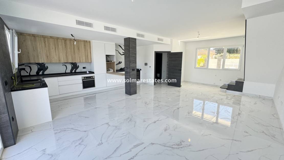 Große Terrassentüren führen vom Wohnzimmer in den hinteren Garten mit Terrassenbereich, privatem Pool und Lounge-/Badebereich im Freien. Diese Villa ist ideal gelegen und alle Annehmlichkeiten sind zu Fuß erreichbar.
