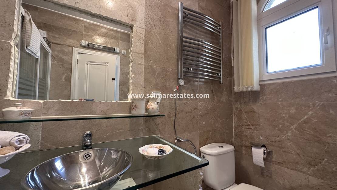 Makellos gepflegte Villa mit direktem Blick auf den Golfplatz Las Ramblas steht zum Verkauf. Dieses beeindruckende, nach Süden ausgerichtete Anwesen wurde so konzipiert, dass jeder Raum einen spektakulären Blick über den Golfplatz und den Pinienwald bietet. Im Erdgeschoss befindet sich ein großzügiges Wohnzimmer mit separatem Fernseh- und Essbereich sowie ein Gäste-WC. Die beeindruckende, voll ausgestattete Küche mit gewölbter Decke und eine Treppe führen zu einem zusätzlichen Ruhebereich und einem privaten Büro. Vom Wohnzimmer aus gelangt man auf eine sehr sonnige Terrasse, einen eigens dafür errichteten Grill und einen Essbereich im Freien mit atemberaubendem Blick auf den Golfplatz. Eine Innentreppe führt hinunter zum Hauptschlafzimmer mit privater Sonnenterrasse, Ankleidezimmer und Doppelbad mit Dusche und Badewanne. Zwei weitere Gästezimmer und ein Gästebad sind ebenfalls vorhanden. Das Anwesen verfügt außerdem über einen zweiten Wohn- und Essbereich mit Küche, Bad und sogar einer Cocktailbar mit direktem Zugang zum Pool und zur Sonnenterrasse. Das Anwesen ist hochwertig ausgestattet und bietet zahlreiche Extras wie eine private Garage, Klimaanlage, zwei Kamine, Moskitonetze, elektrische Tore und eine Alarmanlage.