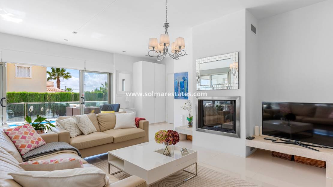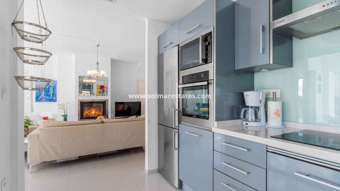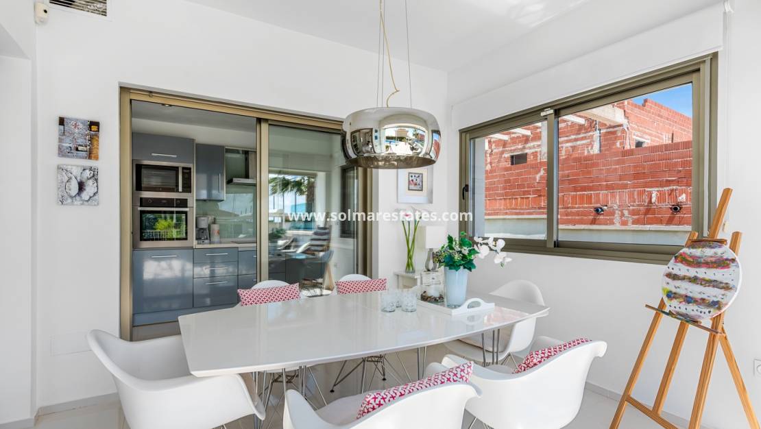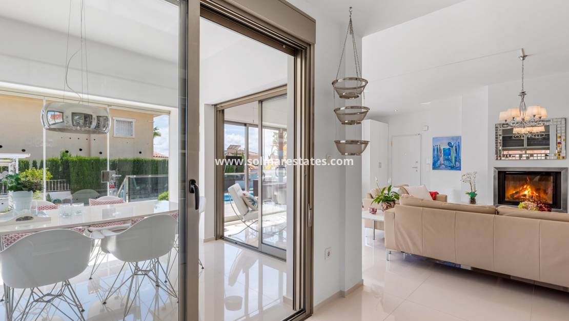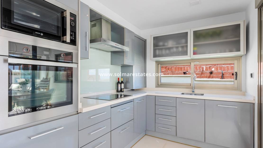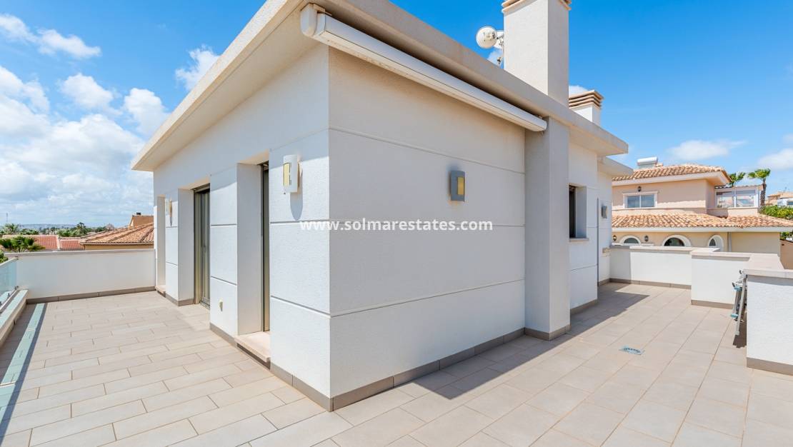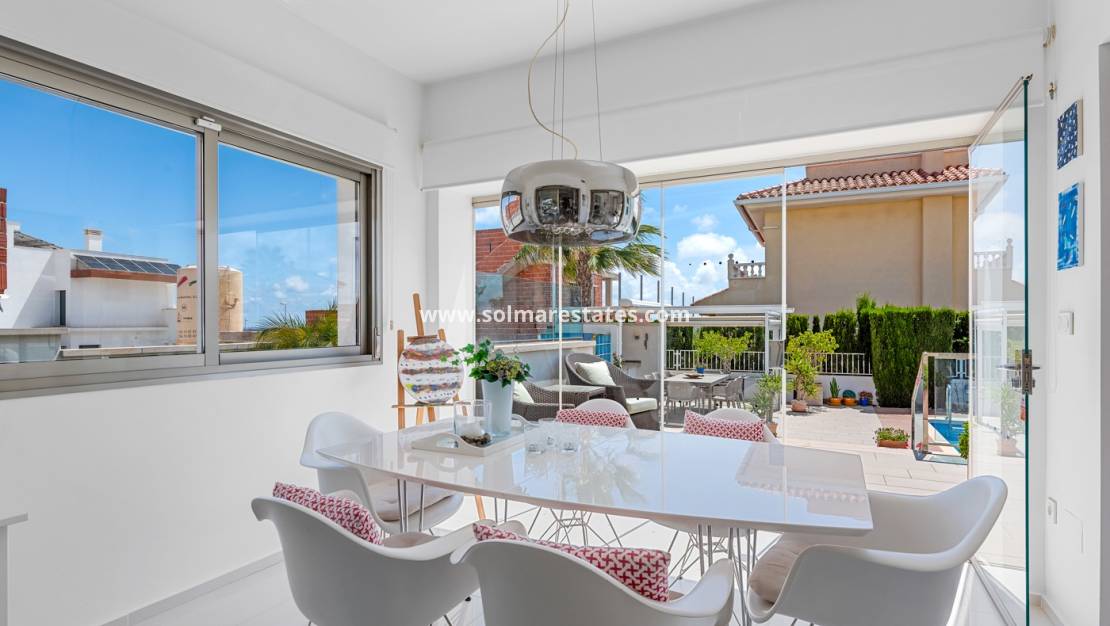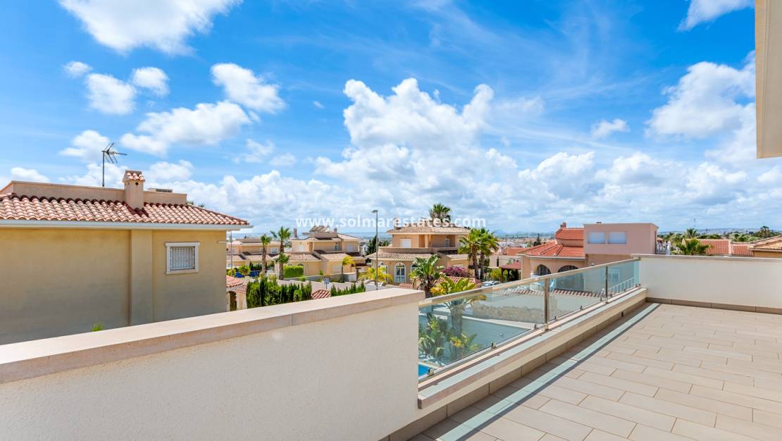 AußenbereichDie Villa befindet sich auf einem 500 m² großen, nach Süden ausgerichteten Grundstück. Hier befindet sich ein schöner Pool mit Platz für Sonnenliegen. Am Ende des Pools befindet sich eine Außenküche mit Grillplatz und überdachtem Esstisch. Die schöne Terrasse mit Blick auf den Pool bietet Zugang vom Wohn- und Esszimmer mit Loungebereich. Auf dem Grundstück befinden sich außerdem ein Parkplatz für ein Auto (automatisches Tor) und ein Abstellraum. Im ersten Stock befindet sich eine große Terrasse mit herrlichem Blick über die Umgebung und den Salzsee von Torrevieja.