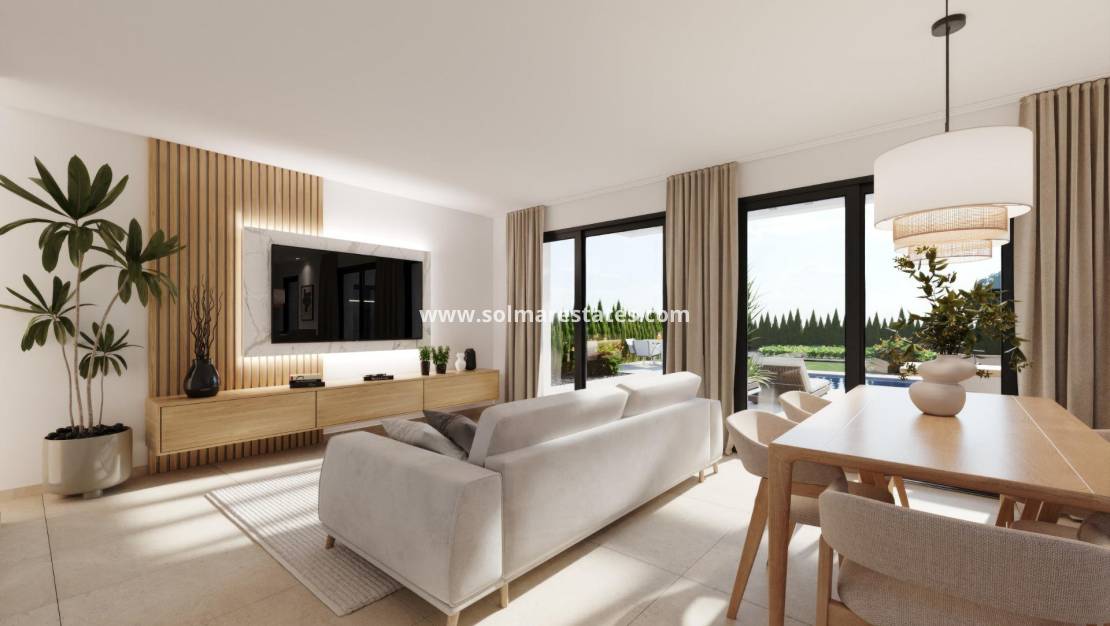 Neubauvillen in Hacienda del Álamo Golf Resort, Murcia Moderne Häuser in einer natürlichen und exklusiven Umgebung Entdecken Sie diese fantastischen Neubau-Villen im renommierten Hacienda del Álamo Golf Resort, einer geschlossenen Wohnanlage in der Region Murcia, die Ruhe, Sicherheit und ein umfassendes Angebot an Dienstleistungen vereint. Umgeben von Natur und mit einem privilegierten Klima ist diese Anlage ideal für diejenigen, die einen entspannten Lebensstil suchen, ohne auf Komfort zu verzichten. Villen mit 3 Schlafzimmern auf einer Etage mit Solarium Die Wohnanlage besteht aus 15 Villen auf Grundstücken ab 550 m². Alle Häuser verfügen über 3 Schlafzimmer und 2 Badezimmer auf einer Etage sowie eine Terrasse mit privatem Pool und eine private Dachterrasse mit Blick auf den Golfplatz. Hochwertige Ausstattung und garantierter Komfort Die Häuser sind mit hochwertigen Materialien gebaut und auf Energieeffizienz und Wohlbefinden ausgelegt: Außenschreinerei mit thermischer Trennung Warmwasser über Aerothermie-System Vorinstallation für Klimaanlage über Kanäle Privater Pool Unabhängige Bewässerungsanlage mit Speicher und individueller Druckerhöhungsanlage, mit Wasseranschlüssen in der Garage und im Garten. Motorisierte Zugangstür für Fahrzeuge. Ein Resort mit umfassendem Service und Golfplatz Hacienda del Álamo ist einer der komplettesten Komplexe an der Costa Cálida. Er verfügt über: Professioneller 18-Loch-Golfplatz Hotel mit Spa Supermarkt Restaurants und Bars Sportplätze und Grünflächen 24-Stunden-Sicherheitsdienst Die Urbanisation vermittelt das Ambiente eines traditionellen mediterranen Dorfes mit ruhigen Straßen und einem gepflegten Design. Strategische Lage in der Nähe von allem Internationaler Flughafen Murcia (Corvera): 20 km Weitere Golfplätze: weniger als 10 km Cartagena: 35 km Strände des Mar Menor: 30 km Einkaufszentrum Espacio Mediterráneo: 28 km Hafen von Mazarrón: 40 km Leben Sie stilvoll an der Costa Cálida Diese Villen sind eine ausgezeichnete Gelegenheit, in einer der vielversprechendsten Gegenden Murcias zu leben oder zu investieren. Kontaktieren Sie uns jetzt und entdecken Sie Ihr neues Zuhause im Hacienda del Álamo Golf Resort.