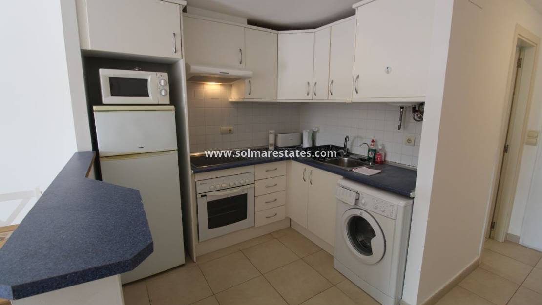 Wohn-/Esszimmer mit Türen zu einem großen Balkon, eine offene Küche, 2 Doppelschlafzimmer, beide mit Einbauschränken, 1 Duschraum, 1 WC, Gemeinschaftspool, Klimaanlage mit Warm- und Kaltwasserzufuhr, Parkplatz abseits der Straße und vieles mehr.