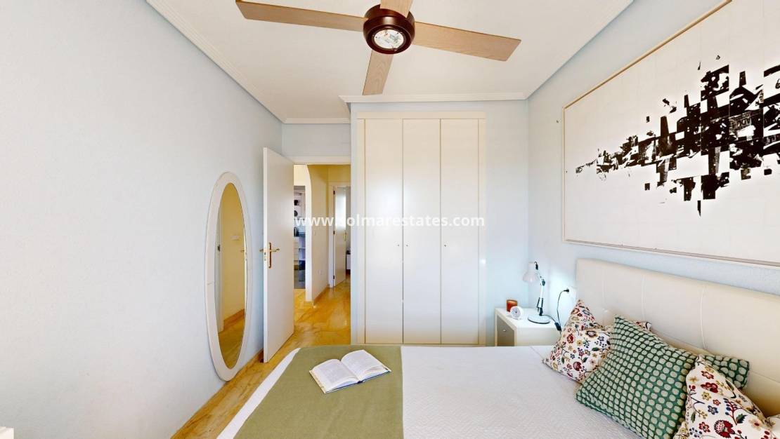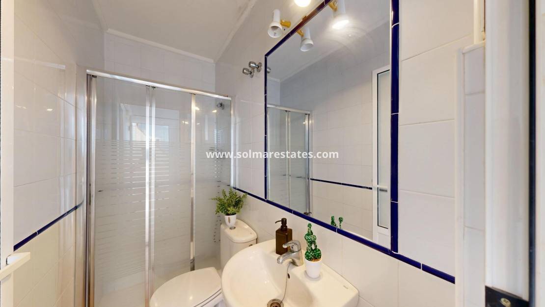 Dieser herrliche Bungalow befindet sich in der Wohnanlage Calas de Campoamor, nur einen kurzen Spaziergang vom Strand entfernt. Das nach Süden ausgerichtete, vollständig nach außen gerichtete Haus hat einen Eingang von zwei Straßen und profitiert von der Querlüftung, die den ganzen Tag über einen kühlen und komfortablen Aufenthalt gewährleistet. Vom Haupteingang aus haben Sie Zugang zu einer Veranda mit Zugang zum Wäschebereich und einem kompletten Badezimmer. Dieser Bereich führt zu einer geräumigen Küche mit viel Stauraum. Sie ist mit dem Wohn-Esszimmer verbunden, das direkt auf die nach Süden ausgerichtete Terrasse und zu einem exklusiven, privaten Bereich der Anlage führt, der absolute Privatsphäre bietet und gleichzeitig Zugang zum Haus bietet. Es verfügt über zwei geräumige Schlafzimmer: Das Hauptschlafzimmer ist ebenfalls nach Süden ausgerichtet und hat ein großes Fenster. Das zweite Schlafzimmer bietet ausreichend Platz für ein Queensize-Bett und ein Etagenbett, das vollständig weggeklappt werden kann, sodass der gesamte Raum frei bleibt. Beide Schlafzimmer haben große Einbauschränke. Es gibt auch ein zweites Badezimmer mit ebenerdiger Dusche. Das Haus besticht durch hochwertige Ausstattung, Marmorböden, doppelt verglaste Fenster und Aluminium-Rollläden, Sicherheitssysteme, weiß lackierte Türen, Klimaanlage, Terrassenmarkise und Ventilatoren. Zu diesem fantastischen Haus gehören außerdem eine große Garage und ein Abstellraum auf dem Grundstück. Es ist eine der besten Wohngegenden in Campoamor und verfügt über einen großen, gepflegten Gemeinschaftspool und Zugang zum Strand Aguamarina von der Anlage aus.