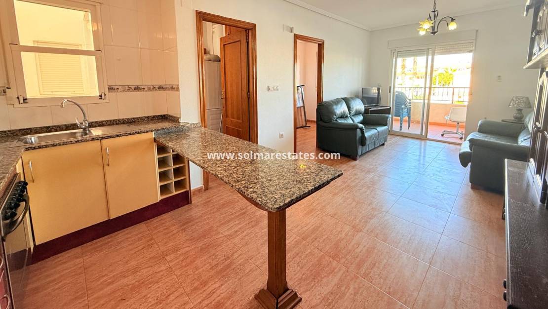 Ein geräumiges Wohn-/Esszimmer mit Klimaanlage (warm/kalt) und Terrassentüren zum Balkon mit Blick auf den Gemeinschaftspool, eine offene Küche, ein separater Hauswirtschafts-/Lagerraum, 2 Doppelschlafzimmer, beide mit Einbauschränken, und 1 Familienbadezimmer.