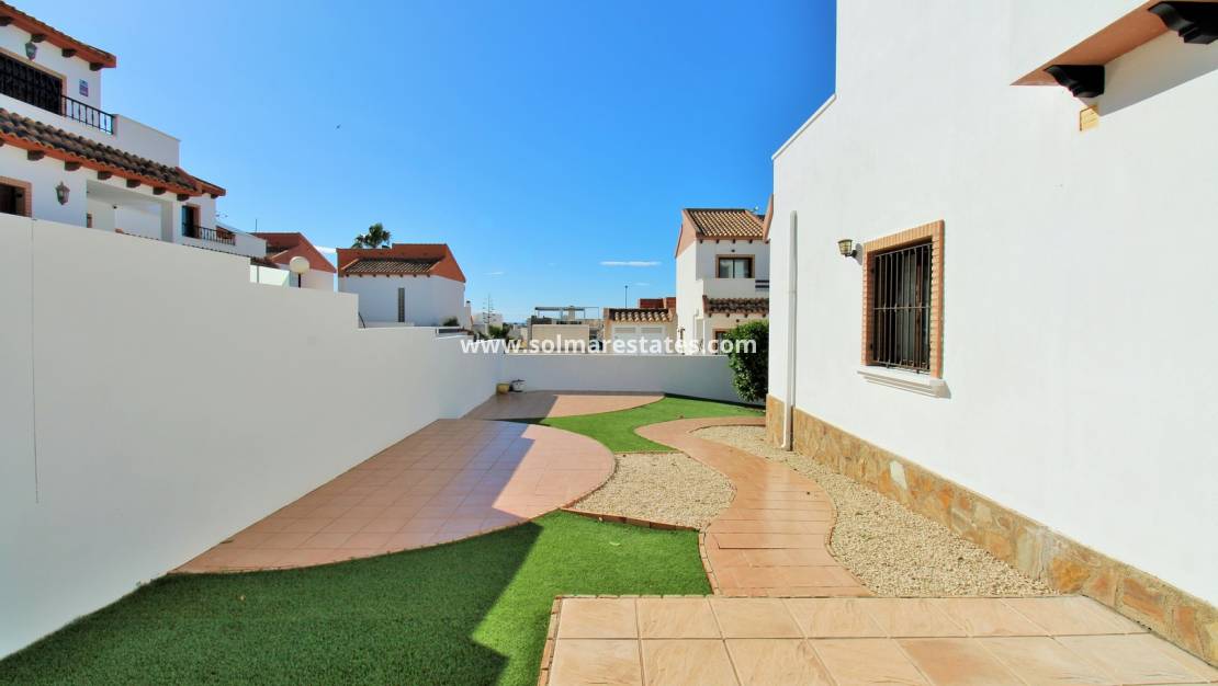 Diese wunderschön gepflegte, freistehende Villa im mediterranen Stil mit 3 Schlafzimmern befindet sich auf dem größten privaten Grundstück der gesamten Urbanisation (240 m²) in der begehrten Wohnanlage Res. El Palmeral/Illios in Pau 8, Villamartin. Das Anwesen genießt eine erstklassige Lage innerhalb der Anlage, nur einen kurzen Spaziergang vom attraktiven Gemeinschaftspool entfernt.