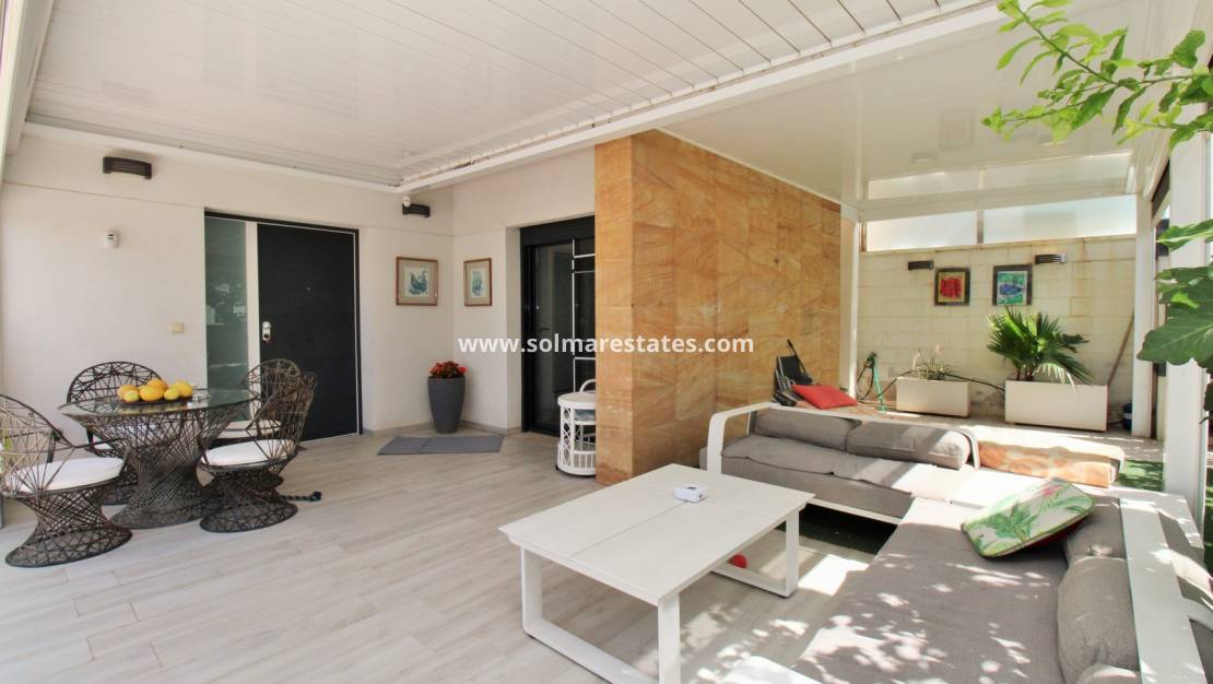 Diese atemberaubende freistehende Villa mit drei Schlafzimmern und drei Badezimmern befindet sich in der äußerst begehrten Wohnanlage Palm Beach II in Lomas de Cabo Roig , nur 2 km von den wunderschönen, mit der Blauen Flagge ausgezeichneten Stränden Aguamarina und La Glea (Campoamor) entfernt.
