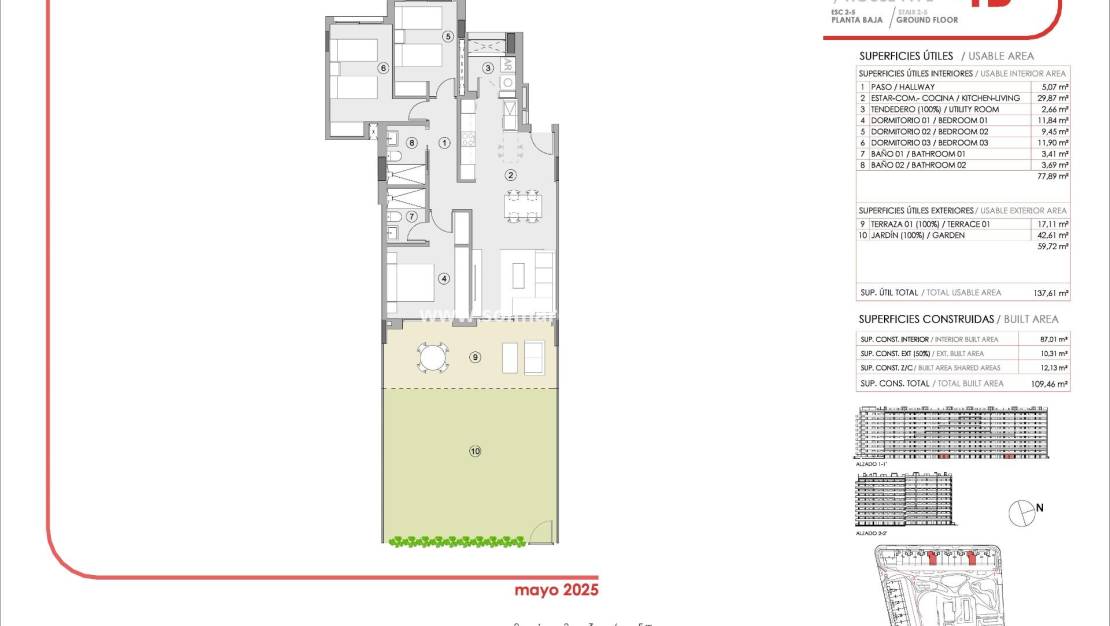 Die Apartments sind mit 2 oder 3 Schlafzimmern und 2 Bädern erhältlich, alle mit zum Wohnzimmer integrierter Küchenzeile, was das Gefühl von Geräumigkeit und Tageslicht maximiert. Die Wohnungen im Erdgeschoss verfügen über einen privaten Garten, die mittleren Etagen bieten große Terrassen und die Penthäuser verfügen über eine Sonnenterrasse, um das ganze Jahr über die Sonne genießen zu können.