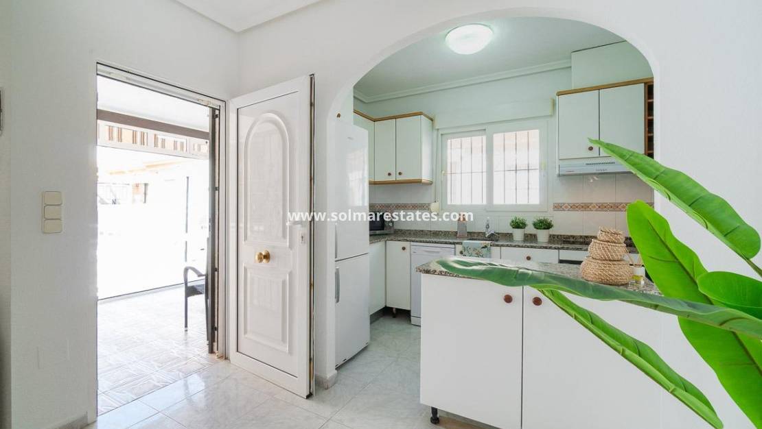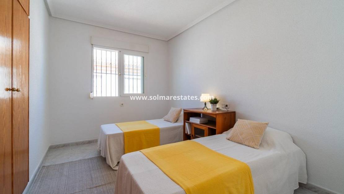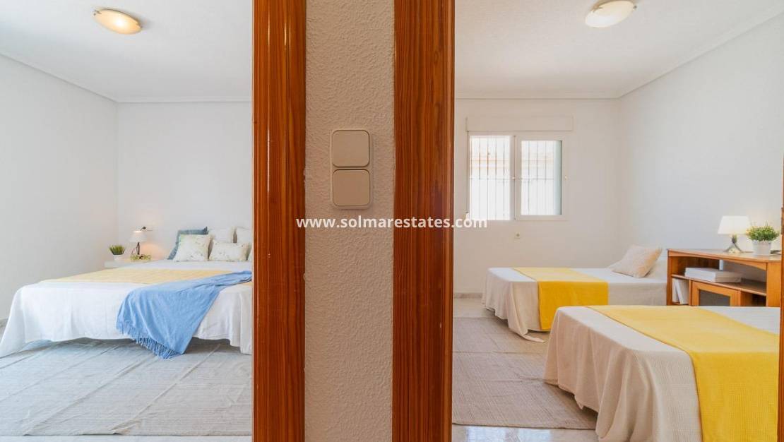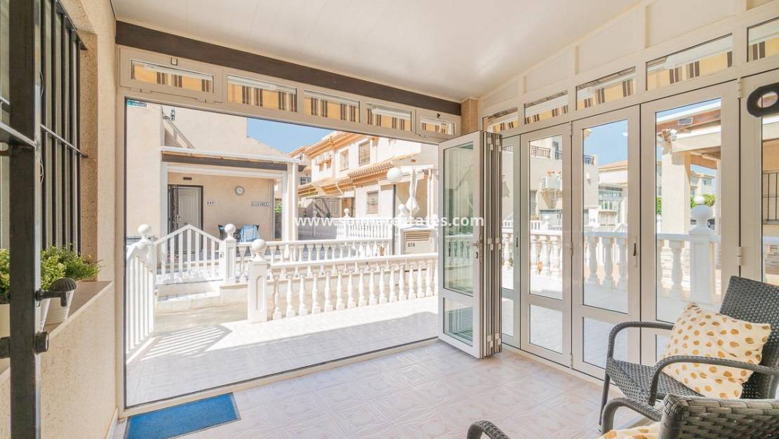 Geräumiges Doppelhaus mit vier Ecken in einer Wohnanlage mit Gemeinschaftspool im Zentrum von Playa Flamenca.~Ganz in der Nähe von Sport- und Freizeitbereichen, dem Einkaufszentrum Zenia Boulevard und anderen Einkaufsvierteln, nur einen kurzen Spaziergang von den Stränden von Playa Flamenca und den örtlichen öffentlichen Schulen, dem Samstagsmarkt sowie Bars und Restaurants entfernt und dennoch in einer ruhigen, geschlossenen Anlage mit Gemeinschaftspool und -gärten, Privatstraßen, die nur von Anwohnern genutzt werden, und Parkplätzen am Fuße der Häuser, sodass Ihre Familie, Koffer und andere Gegenstände in nur wenigen Schritten von Ihrem Fahrzeug zu Ihrem Haus gelangen.~~Das Haus verfügt über eine Eckterrasse mit gefliester Fläche mit Pflanzbereichen und ausreichend Platz für einen Grill, eine Leseecke, einen Chill-out-Bereich oder wie auch immer Sie die mehr als 30 m2 Fläche nutzen möchten. Es verfügt außerdem über einen Aluminium-Abstellraum für Koffer, Werkzeuge und mehr.~In die Eingangsveranda des Hauses wurde eine Aluminium- und Glasummantelung eingebaut, sodass sie sich dank der unschlagbaren Süd-Südwest-Ausrichtung des Hauses perfekt als Winterwohnzimmer eignet. Dies garantiert ganzjährig Sonnenschein. Im Winter können Sie mit der bereits erwähnten Überdachung einen warmen Bereich genießen, der auch den Rest des Hauses heizt. Im Sommer können alle Glasfenster geöffnet werden, um frische Luft hereinzulassen.~~~Das Haus hat drei Schlafzimmer, ein Schlafzimmer im Erdgeschoss und ein Badezimmer mit Dusche auf derselben Etage. Dies bedeutet, dass ältere Menschen mit eingeschränkter Mobilität oder Personen mit einer Behinderung keine Treppen steigen müssen, was die Aufteilung sehr praktisch für Familien aller Art macht.~~~Die Beschreibung beginnt mit dem Betreten des L-förmigen Wohn-/Esszimmers durch die bereits erwähnte verglaste Veranda und den Sicherheitseingang mit großen Fenstern, um den Platz optimal zu nutzen und das gesamte Erdgeschoss mit viel Licht und Sonnenlicht zu versorgen. Das Wohnzimmer bietet Platz für eine Leseecke, eine Fernsehecke und einen Essbereich sowie eine offene Küche mit Frühstücksbar, die mit Schränken und Geräten ausgestattet ist. Im selben Erdgeschoss befindet sich ein Badezimmer mit Dusche zur Nutzung auf der gesamten Etage sowie ein geräumiger Abstellraum unter der Treppe zur Aufbewahrung aller Haushaltsgegenstände, die nicht in den oben genannten Abstellraum auf der Außenterrasse passten.~~Im ersten Stock befinden sich zwei Schlafzimmer, beide mit Einbauschränken, eines davon mit Frühstücksbalkon, und ein komplettes Badezimmer sowie eine Waschküche mit Waschmaschine und einem 80-Liter-Elektro-Warmwasserbereiter.~~Auf dem Dach des Anwesens befindet sich ein 30 Quadratmeter großes Solarium mit freier Aussicht und Platz zum Erholen, Lesen oder einfach zum Genießen der Sonne und der freien Aussicht.~~Das Anwesen wurde gerade gestrichen und dekoriert, und sobald es möbliert ist, können Sie es genießen.~~Ein Besuch lohnt sich, um die vielen Möglichkeiten des Anwesens zu sehen, dank seiner sonnigen Lage, seiner sehr ruhigen Lage, der guten Parkmöglichkeiten und der Tatsache, dass es sich in einem perfekten Zustand befindet und sofort bezugsfertig ist.