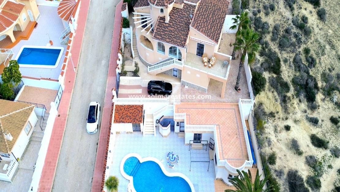 Die Villa liegt auf einem großzügigen Grundstück von 1000 m² und verfügt über zwei Zufahrten, eine davon mit automatischen Toren. Ein großer, beheizter Swimmingpool (12 x 5 m) sorgt in den kälteren Monaten für Komfort.
