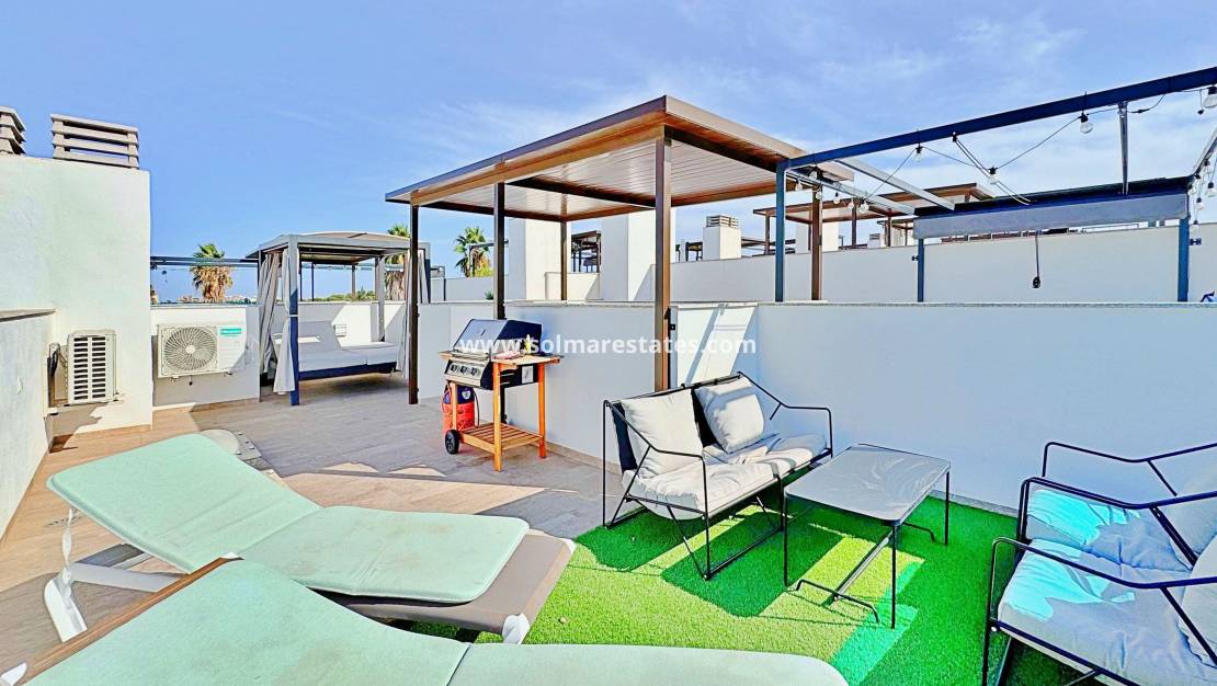 Großzügiges Solarium mit Chill-out-Bereich, Pergola, Grill, Sonnenliegen und Panoramablick auf die Lagune von Torrevieja