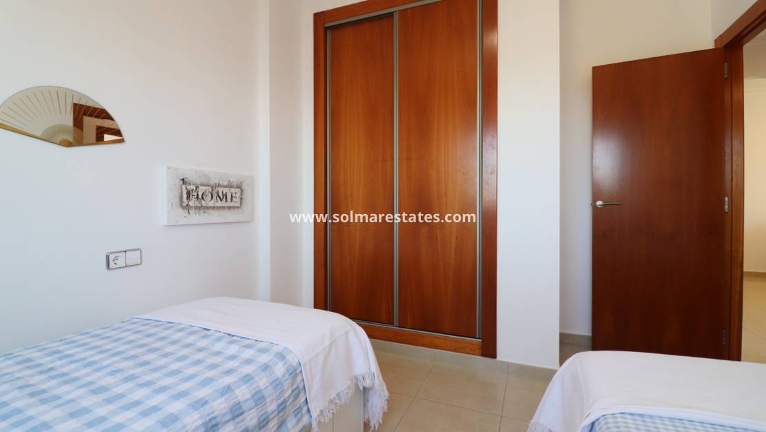 Die Wohnung verfügt über einen hellen und geräumigen offenen Wohnbereich mit Doppelschiebetüren, die auf eine private Terrasse führen. Es gibt eine voll ausgestattete Küche, zwei Doppelschlafzimmer mit Einbauschränken und ein modernes Familienbadezimmer. Die Immobilie befindet sich in begehrter Ecklage und bietet dadurch viel Licht und Privatsphäre.