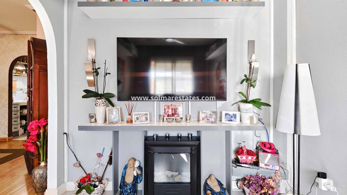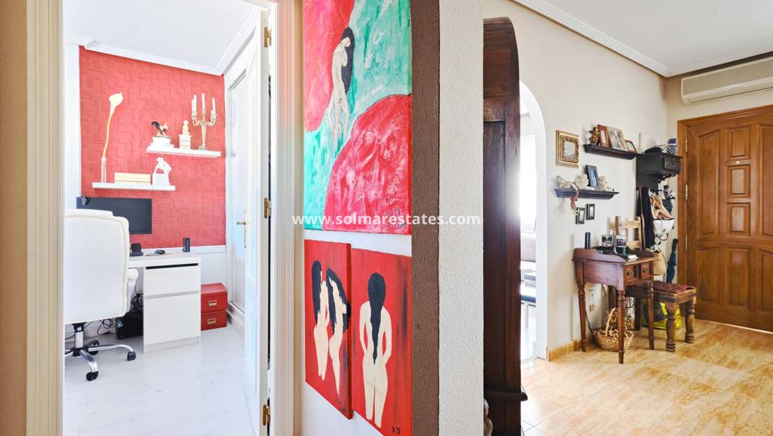 Der Flur führt zu einem großzügigen Hauptschlafzimmer mit Einbauschränken und Klimaanlage sowie einem Familienbadezimmer mit Badewanne. Das zweite Schlafzimmer, das derzeit als zusätzlicher Wohnraum genutzt wird, kann durch den Einbau der Tür problemlos wieder in ein Schlafzimmer umgewandelt werden und verfügt ebenfalls über eine Klimaanlage.