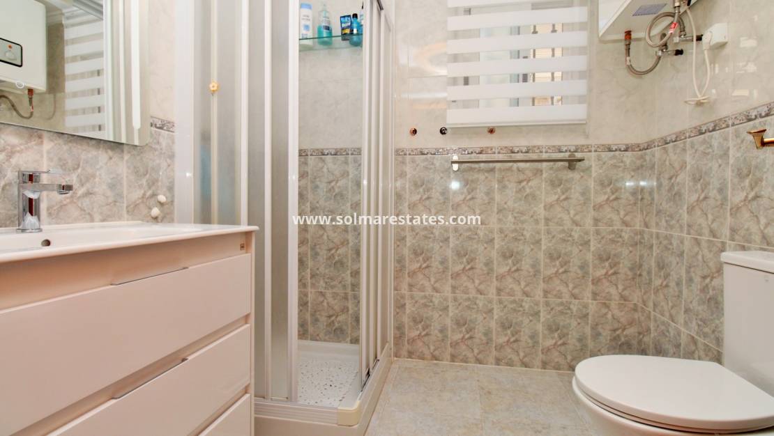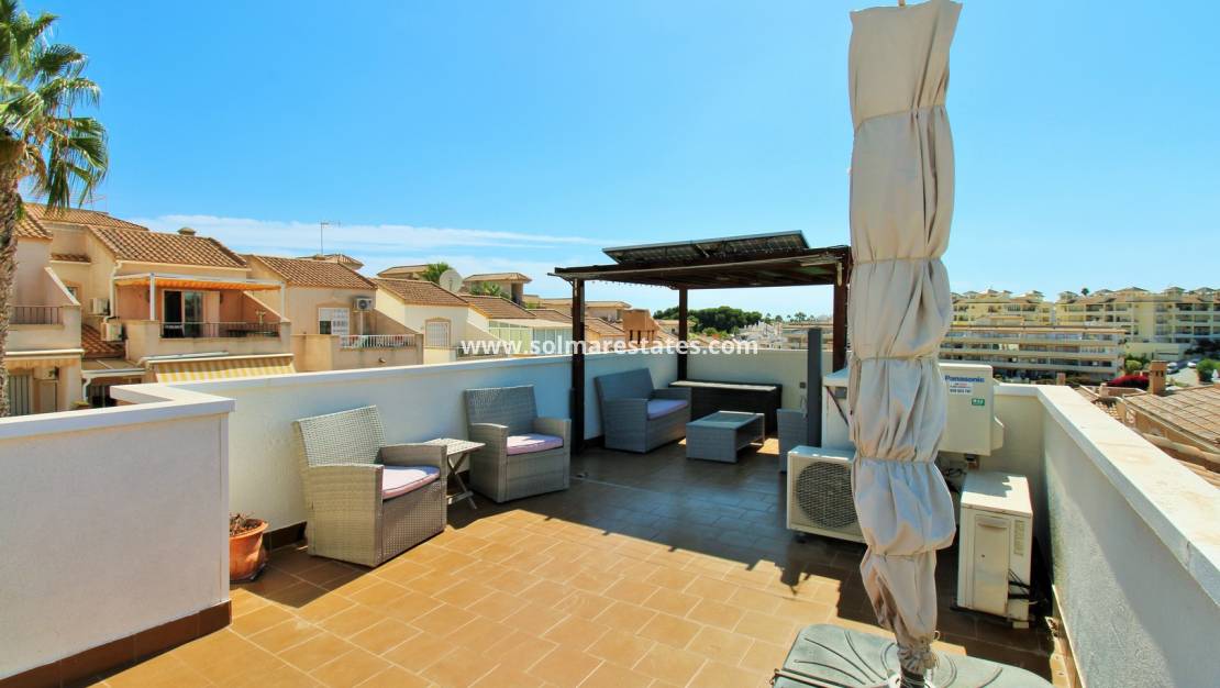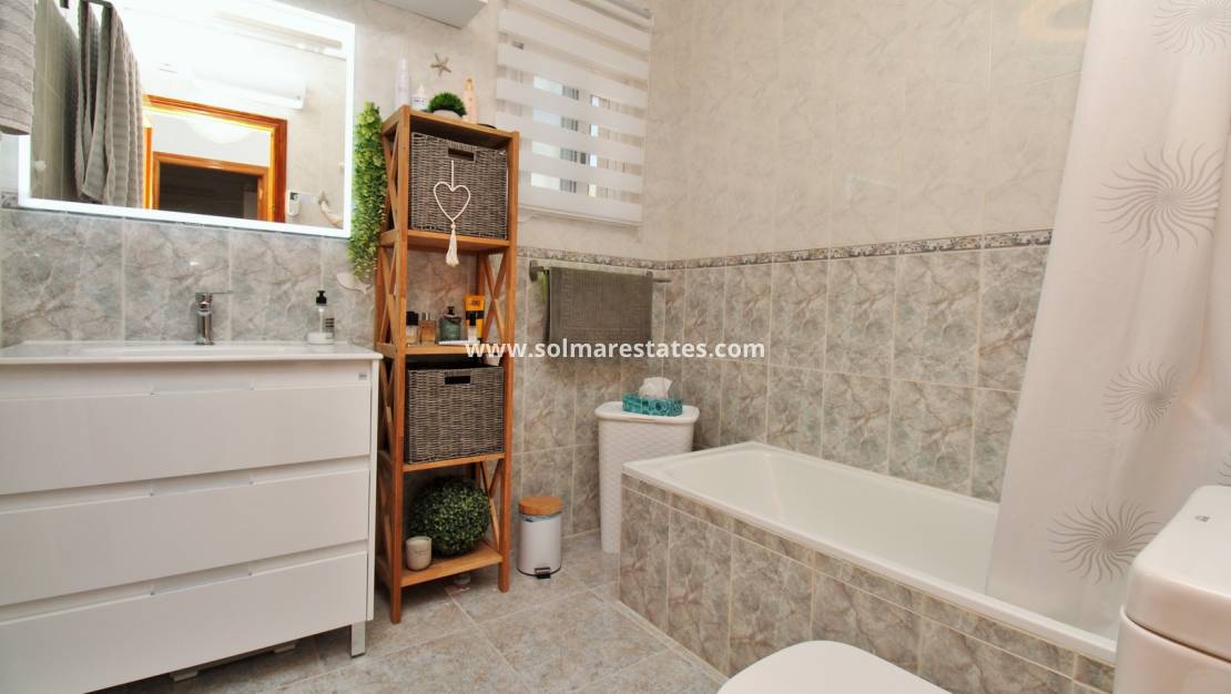 Das Erdgeschoss verfügt über einen hellen Wohn- und Essbereich , eine voll ausgestattete Küche , zwei Doppelschlafzimmer und zwei moderne Badezimmer . Vom Wohnzimmer aus gelangen Sie auf eine private Dachterrasse mit Pergola , auf der Sie mediterrane Abende genießen können, während ein verglaster Balkon/Wintergarten das ganze Jahr über zusätzlichen Wohnraum bietet.