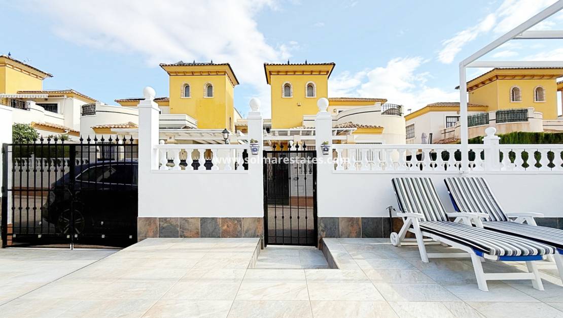 Draußen verfügt die Villa über ein privates Grundstück mit Parkplatz und Abstellraum, was zusätzlichen Komfort bietet. Die geschlossene Wohnanlage bietet attraktive Gemeinschaftsbereiche und einen Swimmingpool, ideal, um das mediterrane Klima zu genießen.