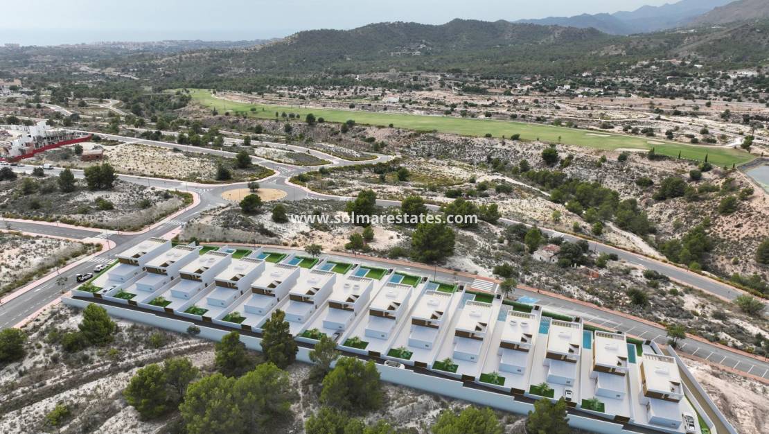 Moderne Villen zum Verkauf im Herzen der Costa Blanca, Alicante Entdecken Sie eine atemberaubende neue Entwicklung von 14 modernen Villen in der Provinz Alicante an der schönen Costa Blanca. Eingebettet zwischen Benidorm, Finestrat und dem ikonischen Berg Puig Campana bieten diese Villen einen atemberaubenden Blick auf das Meer und befinden sich in der Nähe des neu entwickelten Golfplatzes Puig Campana. Mit einer kurzen 10-minütigen Fahrt zu einigen der prestigeträchtigsten Strände Spaniens bieten diese Immobilien einen unvergleichlichen Lebensstil in einer ruhigen und dennoch zugänglichen Umgebung. Erstklassige Lage in der Nähe von Stränden und Annehmlichkeiten Diese Villen sind perfekt gelegen, nur wenige Kilometer von der lebhaften Stadt Benidorm entfernt, die für ihr pulsierendes Nachtleben, ihre goldenen Strände und Familienattraktionen wie den nur 5 km entfernten Themenpark Terra Mítica bekannt ist. Das nur 4 km entfernte Finestrat ist mit seinen charmanten Straßen und seinem Panoramablick der ideale Ort für einen ruhigen Nachmittag. Der internationale Flughafen von Alicante ist nur 40 km entfernt und ermöglicht eine schnelle und bequeme Anreise (Fahrtzeit ca. 25 Minuten). Weltklasse-Golferlebnis Golfliebhaber werden die Nähe zu zwei renommierten Golfplätzen zu schätzen wissen. Der neu eröffnete Puig Campana Golf, ein 9-Loch-Platz, ist nur 1 km entfernt und bietet atemberaubende Aussichten und ein anspruchsvolles Design. Villaitana Golf, 6 km entfernt, bietet zwei exklusive Nicklaus-Design-Plätze: Levante Golf Course, ein 18-Loch-Platz im amerikanischen Stil mit breiten Fairways und anspruchsvollen Hindernissen. Poniente Golf Course, ein technischer 18-Loch-Platz, perfekt für Golfer, die ein kompakteres Layout suchen. Modernes Design und luxuriöse Ausstattung Jede Villa ist in einem modernen Design gestaltet, das schlichte Eleganz mit Funktionalität verbindet. Mit privaten Pools, Parkplätzen, Terrassen und Solarien bieten diese Villen alles, was Sie zur Entspannung und Unterhaltung brauchen. Ausgewählte Einheiten verfügen auch über ein Untergeschoss, das zusätzlichen Platz für individuelle Wohnbereiche bietet. Genießen Sie das Leben an der Costa Blanca, mit einfachem Zugang zu Benidorm, Finestrat und Alicante. Diese Villen bieten die perfekte Mischung aus Luxus, moderner Architektur und hervorragender Lage und eignen sich daher sowohl für den Urlaub als auch für das ganzjährige Wohnen.