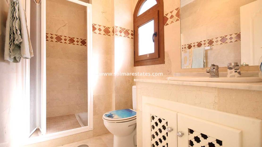 Ein kurzer Flur führt zum Gäste-WC mit Badewanne und Dusche. Das Doppelzimmer ist mit Einbauschränken und Klimaanlage ausgestattet, während das Hauptschlafzimmer über ein eigenes Badezimmer mit ebenerdiger Dusche , Einbauschränken und Klimaanlage verfügt. Marmorböden verleihen dem gesamten Haus ein elegantes Ambiente.