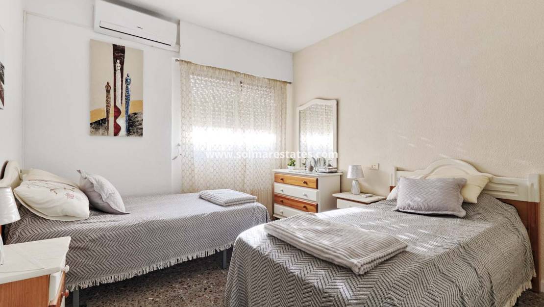 Die Wohnung befindet sich im zweiten Stock. Vom Eingangsbereich gelangt man rechts in ein Doppelzimmer, das derzeit als zweites Wohnzimmer genutzt wird, und links in ein zweites Doppelzimmer mit Einbauschränken und Klimaanlage. Weiter den Flur entlang liegt das Hauptschlafzimmer, ebenfalls mit Klimaanlage und Einbauschränken. Eine versteckte Tür im Kleiderschrank führt zum angrenzenden Badezimmer mit zwei Eingängen, das auch vom Flur aus zugänglich ist. Nebenan befindet sich das zweite Badezimmer mit Dusche.