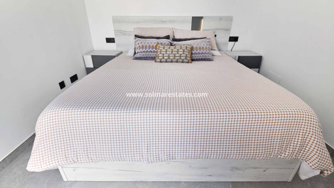 Vom Wohnbereich führt ein Flur zu zwei geräumigen Doppelzimmern im Erdgeschoss. Beide Zimmer verfügen über Einbauschränke und eine neu installierte Klimaanlage. Am Ende des Flurs befindet sich ein modernisiertes Familienbad mit einer großzügigen, ebenerdigen Dusche.