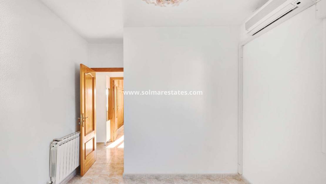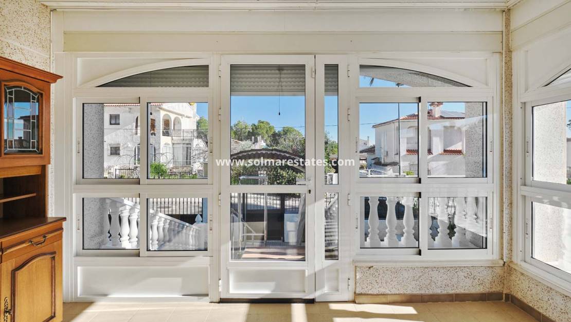 Durch das Fußgängertor gelangt man auf das Grundstück. Eine Treppe führt hinauf in einen hellen, verglasten Wintergarten und in das Hauptgeschoss der Villa. Hier befinden sich ein geräumiges Wohnzimmer mit Kamin, eine separate, gut geschnittene Küche mit Speisekammer, zwei Familienbäder und vier Doppelschlafzimmer, von denen zwei über Einbauschränke verfügen. Die Raumaufteilung ist sehr flexibel und kann bei Bedarf problemlos umgestaltet werden, um größere Schlafzimmer oder einen offenen Wohnbereich zu schaffen.