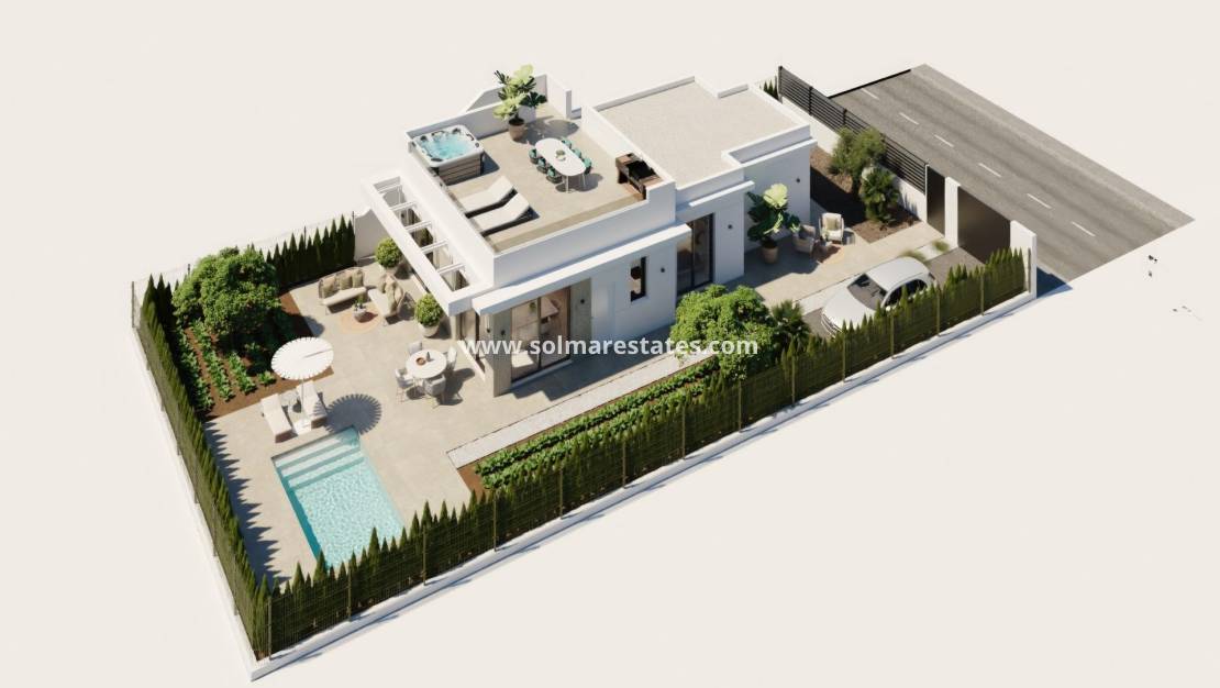 Neubauvillen im Hacienda del Álamo Golf Resort, Murcia Moderne Wohnungen in einer natürlichen und exklusiven Umgebung Entdecken Sie diese fantastischen Neubau-Villen im renommierten Hacienda del Álamo Golf Resort, einer geschlossenen Wohnanlage in der Region Murcia, die Ruhe, Sicherheit und ein umfassendes Dienstleistungsangebot vereint. Umgeben von Natur und mit einem privilegierten Klima ist dieser Komplex ideal für diejenigen, die einen entspannten Lebensstil suchen, ohne auf Komfort zu verzichten. Villen mit 2 oder 3 Schlafzimmern auf einer Etage mit privater Sonnenterrasse Die Wohnanlage besteht aus 17 Villen auf Grundstücken ab 300 m². Sie können zwischen Häusern mit 2 oder 3 Schlafzimmern und 2 Badezimmern auf einer Etage wählen, zusätzlich zu einer Terrasse mit privatem 6x2,4 m großen Pool und einer privaten Sonnenterrasse auf dem Dach. Hochwertige Ausstattung und garantierter Komfort Die Häuser sind mit hochwertigen Materialien ausgestattet und auf Energieeffizienz und Wohlbefinden ausgelegt: Außenfenster und -türen mit thermischer Trennung Warmwasserbereitung durch Aerothermie-System Vorinstallation für Klimaanlage mit Kanälen Privater Pool Unabhängige Bewässerungsanlage mit Speicher und individueller Druckerhöhungsanlage. Motorisierte Zugangstür für Fahrzeuge. Motorisierte Rollläden in den Schlafzimmern Sicherheitstür Ein Resort mit umfassendem Service und Golfplatz Hacienda del Álamo ist einer der komplettesten Komplexe an der Costa Cálida. Er verfügt über: Professioneller 18-Loch-Golfplatz Hotel mit Spa Supermarkt Restaurants und Bars Sportplätze und Grünflächen 24-Stunden-Sicherheitsdienst Die Wohnanlage vermittelt das Ambiente eines traditionellen Mittelmeerdorfes mit ruhigen Straßen und einem gepflegten Design. Strategische Lage in der Nähe von allem Internationaler Flughafen Murcia (Corvera): 20 km Weitere Golfplätze: weniger als 10 km Cartagena: 35 km Strände des Mar Menor: 30 km Einkaufszentrum Espacio Mediterráneo: 28 km Hafen von Mazarrón: 40 km Leben Sie stilvoll an der Costa Cálida Diese Villen bieten eine hervorragende Gelegenheit, in einer der vielversprechendsten Gegenden Murcias zu leben oder zu investieren. Kontaktieren Sie uns jetzt und entdecken Sie Ihr nächstes Zuhause im Hacienda del Álamo Golf Resort.