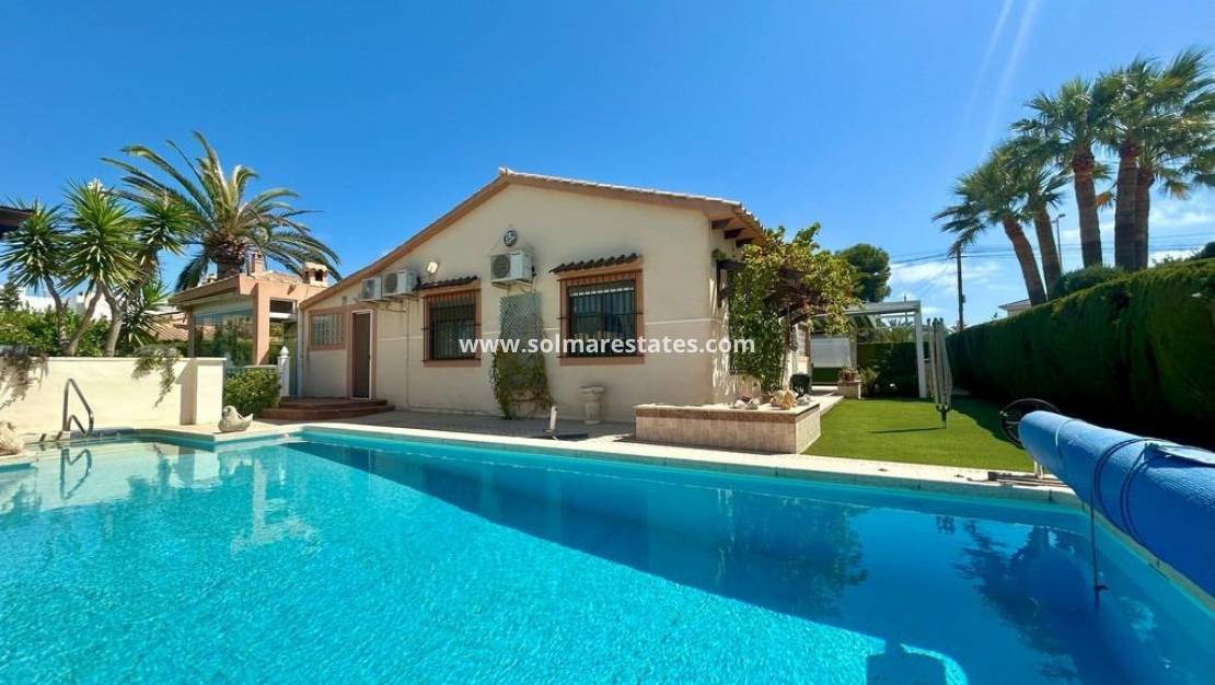Wir freuen uns, Ihnen diese atemberaubende, ebenerdige Villa in Cabo Roig präsentieren zu dürfen. Sie liegt nur 10 Minuten vom Strand entfernt in einer der begehrtesten Gegenden der Orihuela Costa. Das Anwesen befindet sich auf einem 800 m² großen Grundstück mit 140 m² Wohnfläche und bietet einen großzügigen Garten, einen privaten Swimmingpool, ein Gartenhaus aus Holz und eine Pergola – ideal zum Entspannen und für gesellige Stunden mit Familie und Freunden.