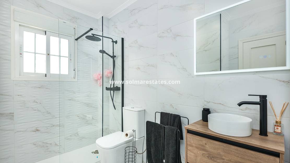 Die Raumaufteilung des Hauses legt Wert auf Komfort und Bequemlichkeit. Im Erdgeschoss bieten ein Schlafzimmer und ein Badezimmer bequemen Zugang für Gäste oder ermöglichen barrierefreies Wohnen. Im Obergeschoss bieten zwei weitere Schlafzimmer – darunter eine luxuriöse Master-Suite mit Balkon – und ein Badezimmer ausreichend Platz für Familie oder Besucher. Die großzügige Dachterrasse mit Solarium bietet einen Panoramablick und ist ideal zum Essen im Freien, Entspannen oder um die spektakuläre Umgebung zu genießen.