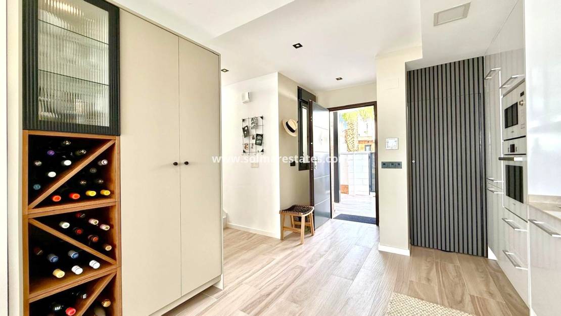 Die Villa öffnet sich zu einer Eingangshalle, die in einen stilvollen offenen Küchen-, Ess- und Wohnbereich führt. Große Türen ermöglichen einen nahtlosen Zugang zu den Sonnenterrassen und dem beheizten privaten Swimmingpool – ideal zum Entspannen und für gesellige Stunden.