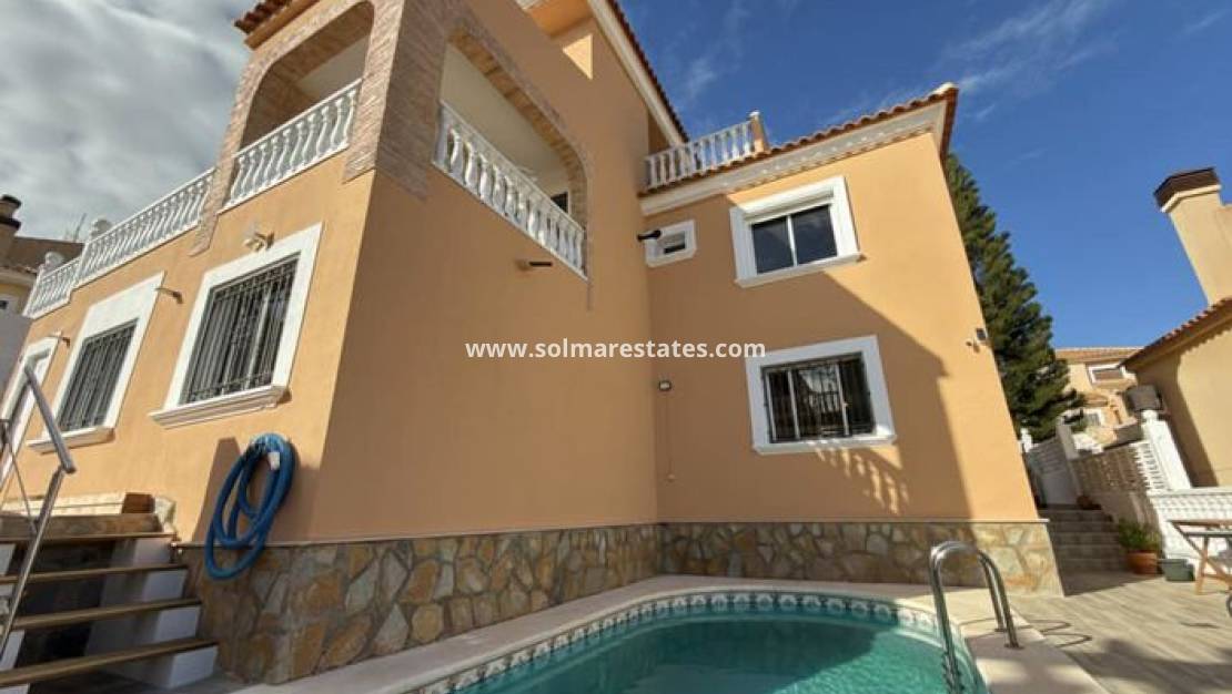 Diese beeindruckende Villa in El Galan, Villamartín, liegt auf einem großzügigen 500 m² großen Grundstück und bietet vielseitige Wohnmöglichkeiten auf drei Ebenen – perfekt für Familien oder als Ferienhaus mit Gästeunterkunft.