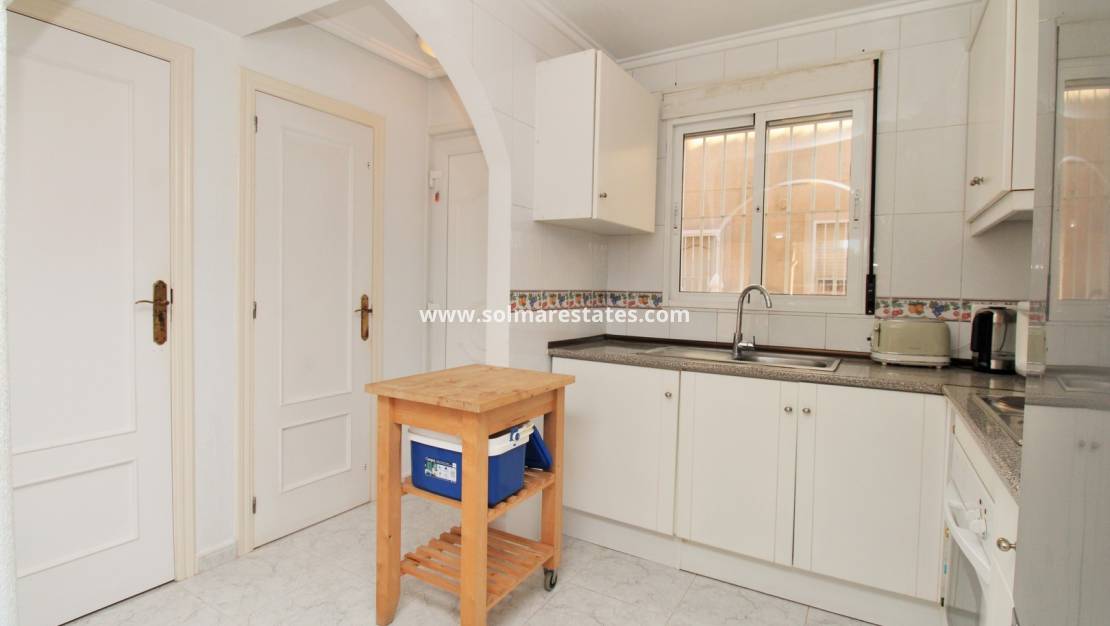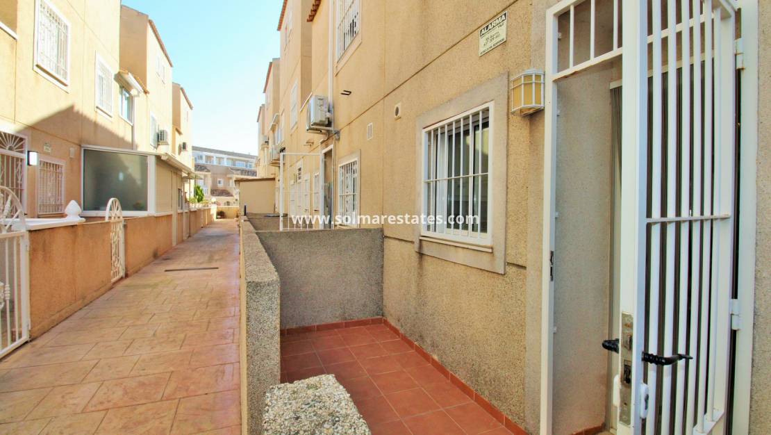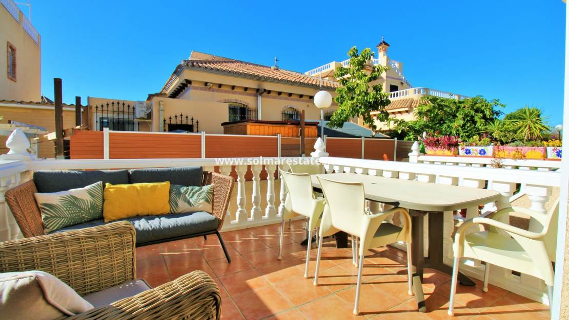 Ein geräumiges, nach Süden ausgerichtetes Reihenhaus mit 3 Schlafzimmern in der geschlossenen Wohnanlage Paola II, Playa Flamenca , das einen hervorragenden Außenbereich, eine private Garage mit direktem Zugang zum Haus und eine erstklassige Lage in der Nähe von Einkaufsmöglichkeiten und anderen Annehmlichkeiten bietet.
