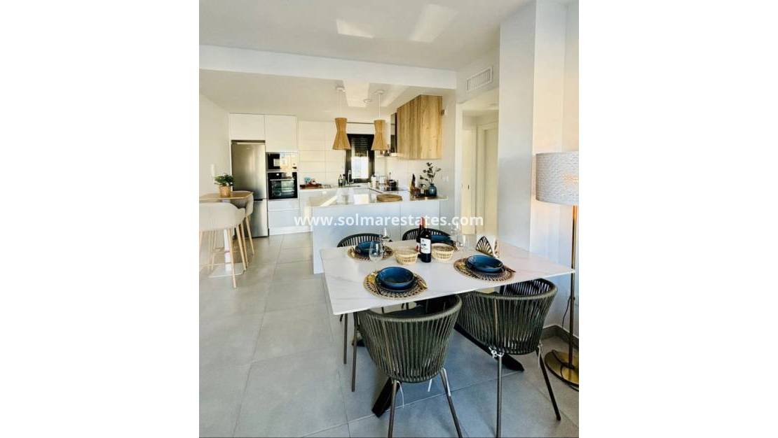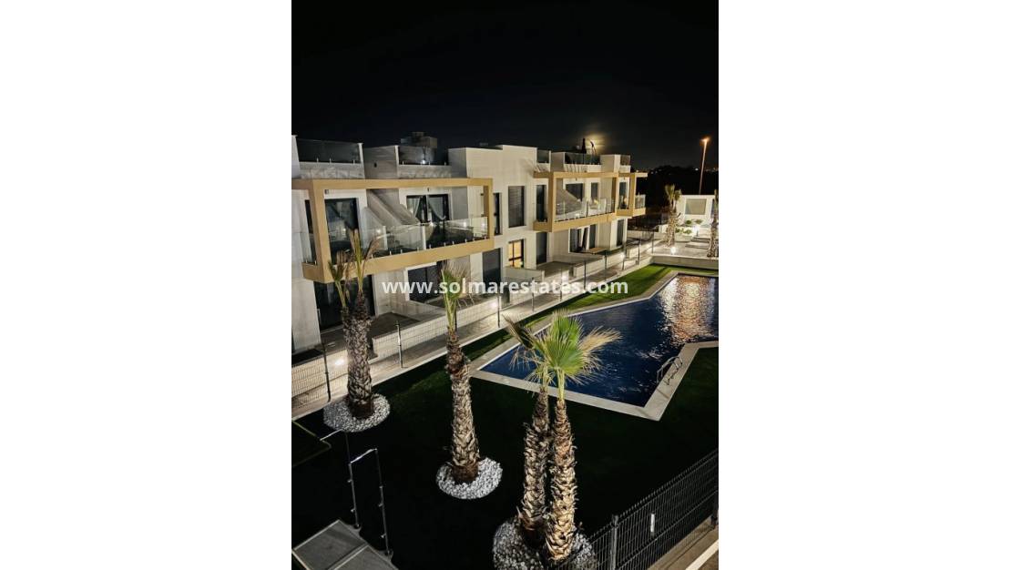 Die Immobilie besticht durch ein helles und modernes Raumkonzept mit zwei geräumigen Schlafzimmern und zwei Badezimmern, darunter ein Hauptschlafzimmer mit eigenem Bad. Der offene Wohnbereich ist lichtdurchflutet und geht nahtlos in eine private Terrasse über, die den Blick auf den Gemeinschaftspool und die Umgebung freigibt und so eine entspannende und einladende Atmosphäre schafft.