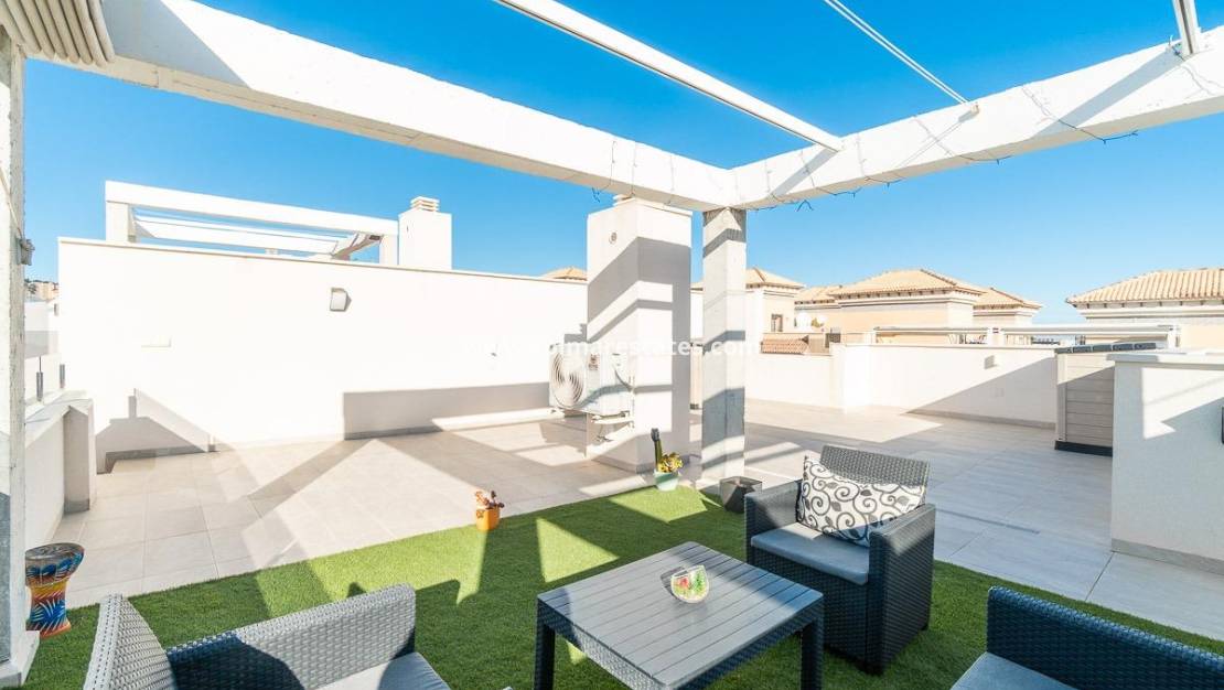 Entdecken Sie dieses außergewöhnliche Bungalow-Apartment in oberster Etage in der prestigeträchtigen Gegend PAU 26, Orihuela Costa, wo modernes Design, Komfort und Lebensqualität perfekt miteinander verschmelzen.~~Diese neuwertige Immobilie aus dem Jahr 2022 verfügt über 76 m2 Wohnfläche, eine funktionale Raumaufteilung und eine hervorragende Südausrichtung, die den ganzen Tag über für viel natürliches Licht sorgt.~~Der Zugang erfolgt über eine private und exklusive Wohnanlage mit nur 24 Einheiten, die Ruhe, Privatsphäre und ein gehobenes Wohnambiente garantiert. Beim Betreten empfängt Sie ein helles und großzügiges Wohn-Esszimmer mit moderner offener Küche. Von hier aus gelangen Sie auf den 12 m2 großen Balkon, ausgestattet mit elektrischer Markise und Kunstrasen, ideal, um das mediterrane Klima das ganze Jahr über zu genießen.~Die Immobilie verfügt außerdem über einen Hauswirtschaftsraum, zwei geräumige Doppelschlafzimmer und zwei voll ausgestattete Badezimmer, beide mit Fußbodenheizung, die höchsten Wohnkomfort bieten.~~Vom Balkon führt eine private Treppe zum Highlight der Immobilie: einem beeindruckenden privaten Solarium von ca. 71 m2, ausgestattet mit Kunstrasen und Markisen, perfekt für einen exklusiven Chill-out-Bereich oder entspannte Stunden unter der Sonne.~~Zu den Ausstattungsmerkmalen gehören Feinsteinzeugböden, Fliegengitter an allen Fenstern, Sicherheitseingangstür, elektrische Markise auf dem Balkon sowie eine manuelle Markise an der Pergola des Solariums.~~Die Immobilie wird inklusive privatem Stellplatz und abgeschlossenem Abstellraum verkauft.~~Die Wohnanlage bietet einen wunderschönen Gemeinschaftspool, sehr gepflegte Grünanlagen und hochwertige Gemeinschaftsbereiche – ein echtes Luxusambiente.~~Nur 3,5 km vom Meer entfernt, befinden sich die beliebten Strände La Zenia und Playa Flamenca in unmittelbarer Nähe, bekannt für ihre kristallklaren Gewässer und hervorragende Infrastruktur.~~Dank der Nähe zu renommierten Golfplätzen ist diese Immobilie zudem eine sehr gefragte Ferieninvestition mit hohem Vermietungspotenzial.~~ Eine Immobilie, die Exklusivität, Komfort und mediterranes Lebensgefühl vereint.~Eine einmalige Gelegenheit – kontaktieren Sie uns noch heute.~Preis: 349.000 €~Steuern und Kaufnebenkosten nicht inbegriffen (gemäß geltender Gesetzgebung). Eine Aufstellung der zusätzlichen Kosten wird vor der Reservierung zur Verfügung gestellt.