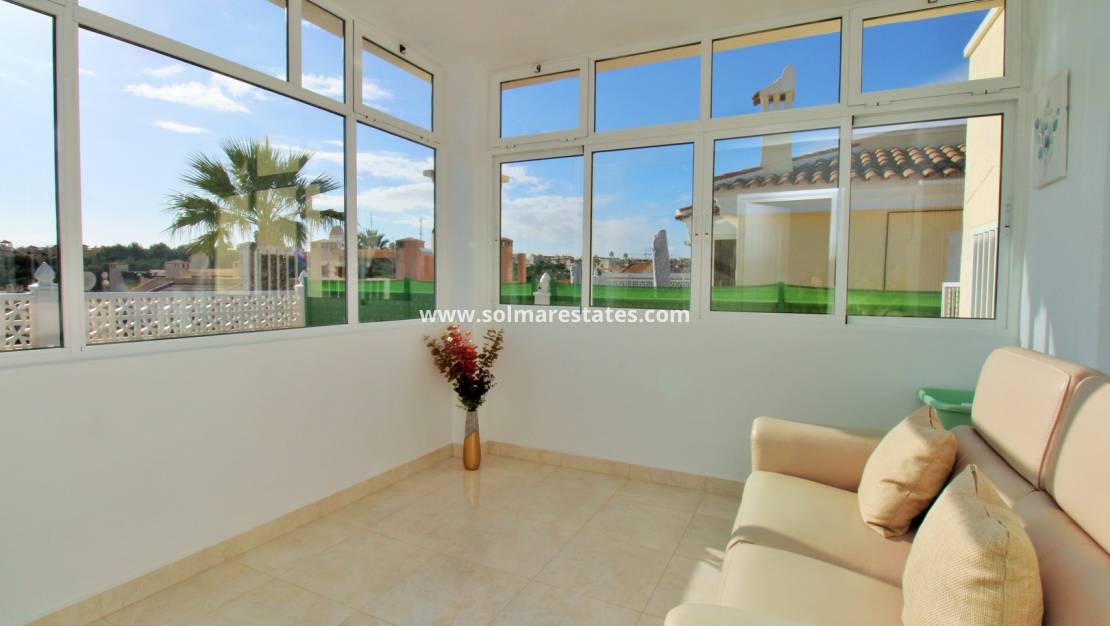 An der Vorderseite verbindet eine sonnige, geschlossene Veranda nahtlos den Innen- und Außenbereich und bietet direkten Zugang zum Pool und zur Terrasse. Eine Außentreppe führt zu einem großzügigen, privaten Dachsolarium – ideal zum Entspannen, Sonnenbaden oder für gesellige Stunden in absoluter Privatsphäre.
