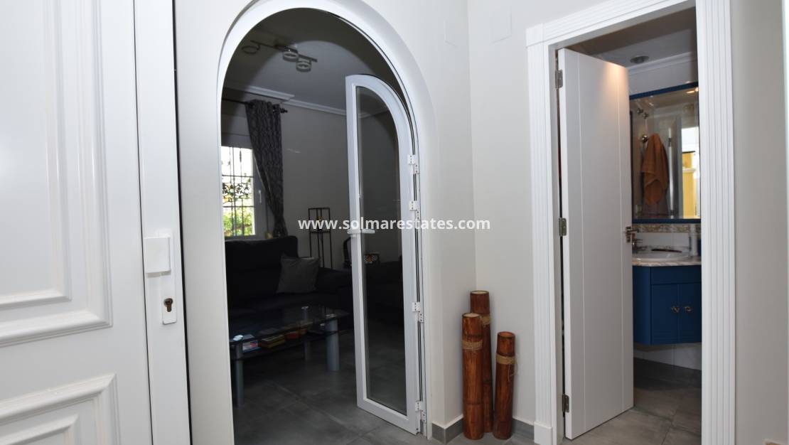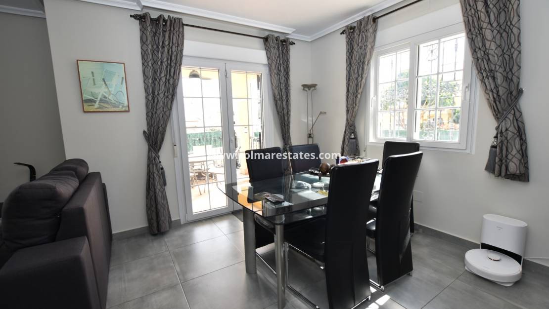 Diese wunderschöne, freistehende Villa in Los Dolses befindet sich in idealer Lage auf einem begehrten Eckgrundstück in einer der besten Gegenden der Anlage. Das Anwesen präsentiert sich in exzellentem Zustand, wurde kürzlich außen neu gestrichen und ist bezugsfertig. Eine neue Panasonic-Klimaanlage wurde im gesamten Haus installiert.