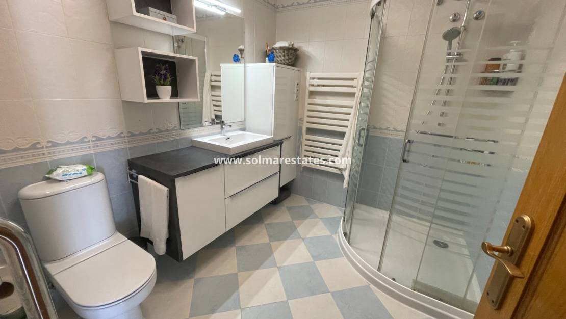 Im ersten Stock befinden sich zwei weitere Doppelschlafzimmer mit Zugang zu einer geschlossenen Terrasse, die derzeit als Wohnzimmer genutzt wird, sowie ein weiteres modernes Familienbadezimmer mit Dusche. Ein privates Solarium bietet zusätzlichen Platz im Freien, um die Sonne zu genießen.
