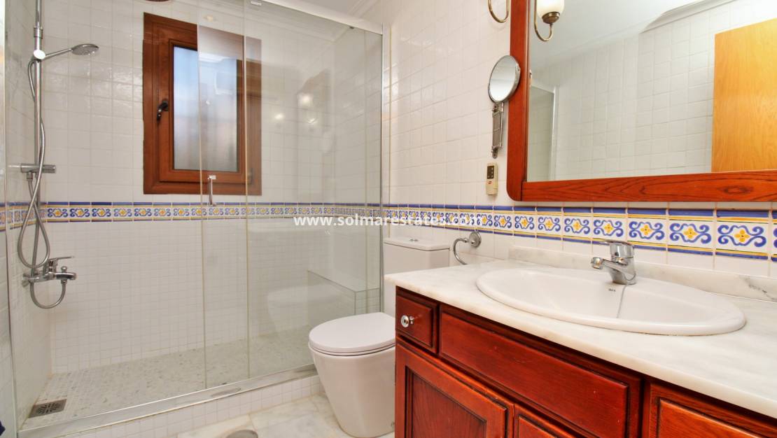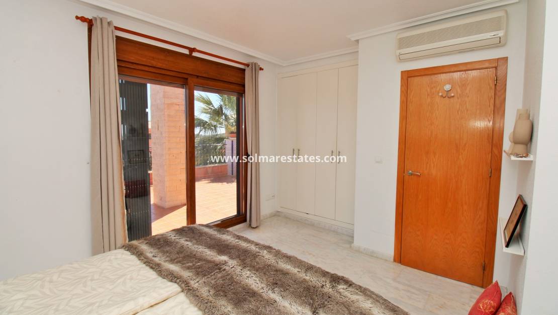 Im Obergeschoss bietet die Master-Suite einen privaten Rückzugsort mit Einbauschränken, eigenem Badezimmer und direktem Zugang zu einer sonnigen Dachterrasse. Von hier aus genießen Sie einen Panoramablick auf das Mittelmeer, die umliegende Landschaft und die berühmten Salzseen von Torrevieja – ein perfekter Ort zum Entspannen und für laue Abende im Freien.
