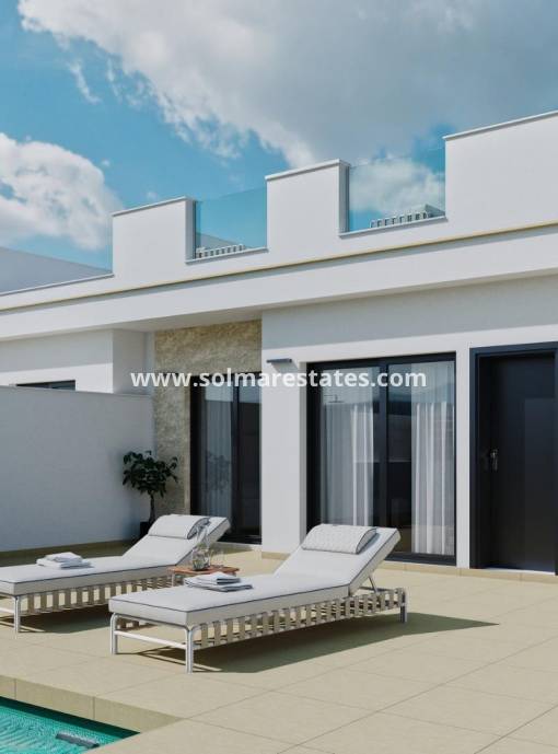 NEU GEBAUTE DOPPELHAUSHÄLFTEN IN ROLDAN Neubau von Villen mit 3 Schlafzimmern, Parkplätzen auf der Vorderseite, Steinmauern, privatem Swimmingpool auf der Rückseite, großer Dachterrasse und einem Abstellraum in Roldan, Torre-Pacheco. Die Villen sind auf einer Ebene mit erhöhter Decke in der Küche entworfen, jede Villa verfügt über Wrap-around-Terrasse / Sonne Zonen im Erdgeschoss und eine große private Sonnenterrasse im ersten Stock zu genießen Stunden der Sonne, das ganze Jahr über. 3 Schlafzimmer (Hauptschlafzimmer en-suite) und ein separates Familienbadezimmer... entworfen im zeitgenössischen "Öko"-Stil und mit einem offenen Konzept, bestehend aus einer Einbauküche und einem Wohn-Esszimmer, einem Abstellraum auf der Vorderseite und einem privaten Sommerterrassenbereich. Die Villen verfügen über einen privaten Swimmingpool auf der Rückseite mit Außendusche, Solarium, Terrassenbereiche, voll ausgestattete Küche und Bäder mit LED-Spiegeln, gefütterte Kleiderschränke mit Schubladen, Innen- und Außenbeleuchtung, vorinstallierte Klimaanlage. Abgewinkelte Wände und Steinverkleidungen an der Vorderseite und im Treppenhaus machen diese Villa zu einem echten Hingucker mit Stil. Die Anlage befindet sich in einem Wohngebiet von Roldan, umgeben von Dienstleistungen, Parks, Sportanlagen, zwei Golfplätzen und nur 12 Minuten von den herrlichen Stränden des Mittelmeers und des Mar Menor entfernt. Es handelt sich um ein ausgewähltes Projekt mit nur 20 modernen einstöckigen Villen, die alle über großzügige Grundstücke mit privatem Swimmingpool und Dachterrasse verfügen. Roldan selbst ist eine traditionelle Stadt mit allen lokalen Annehmlichkeiten, die Sie benötigen, einschließlich Supermärkte, Restaurants, Bars, Gesundheitsklinik, Apotheke, Polizeistation, Tankstelle, Mechaniker, Zahnärzte, Ärzte und mehr. Die nahegelegenen Golfplätze von La Torre und Terrazas sind leicht zu erreichen, der Flughafen Corvera ist 15 Minuten entfernt und die Strände des Mar Menor sind nur 20 Minuten Fahrt entfernt.