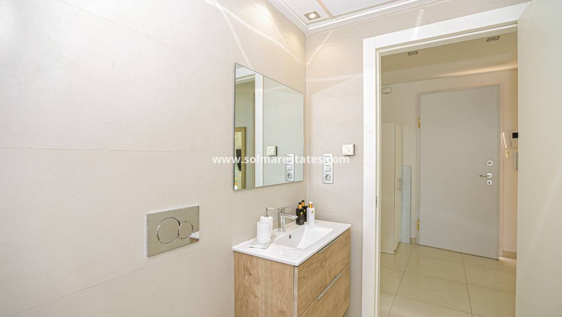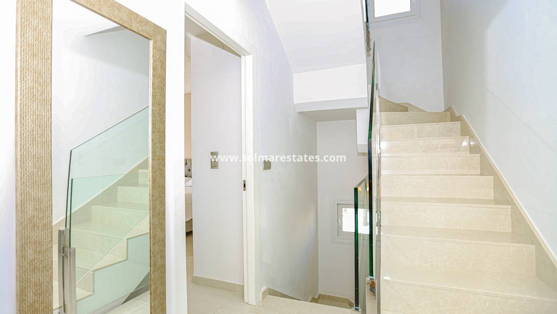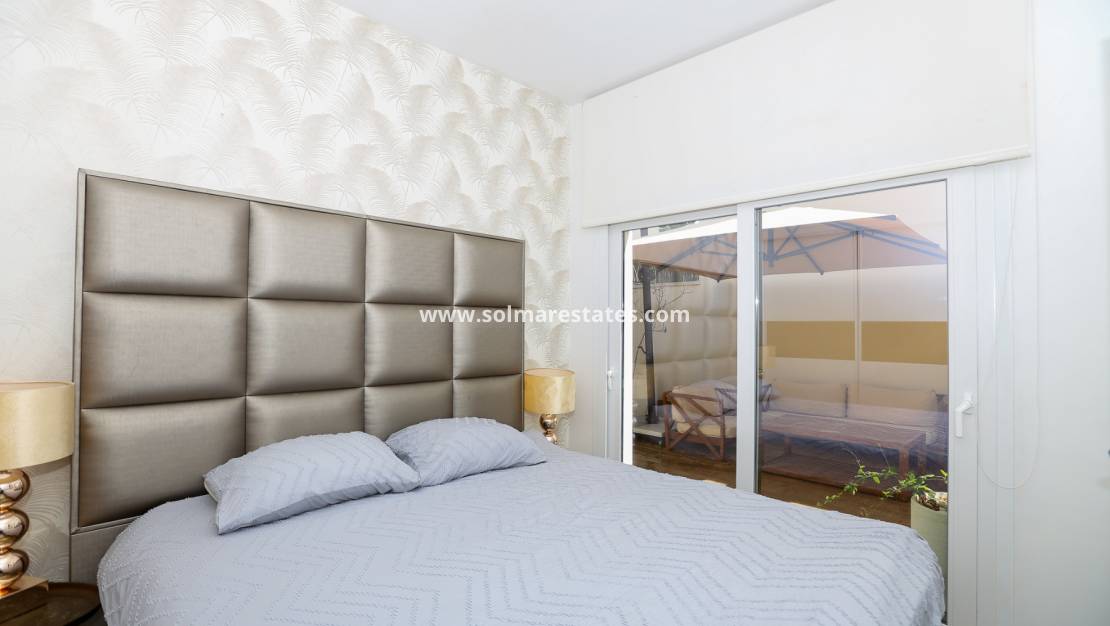 Das Erdgeschoss umfasst ein Schlafzimmer mit direktem Zugang nach draußen und ein Badezimmer mit Fußbodenheizung. Der großzügige Wohnbereich besteht aus einem geräumigen Wohn-Esszimmer und einer voll ausgestatteten offenen Küche. Elektrische Rollläden sind in allen Räumen außer den Wohnzimmerfenstern installiert.