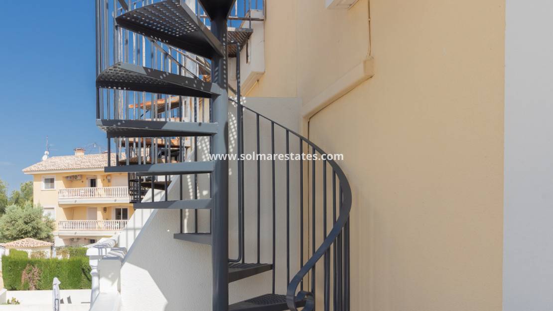 Das Anwesen bietet zwei geräumige Doppelschlafzimmer mit Einbauschränken, beide im ersten Stock. Das Hauptschlafzimmer verfügt über einen sonnigen, nach Südwesten ausgerichteten Balkon mit direktem Zugang zu einer großzügigen Dachterrasse. Von hier aus genießen Sie einen freien Blick auf das Mittelmeer im Vordergrund sowie auf den Gemeinschaftspool und die Gärten im Hintergrund – ein idealer Ort zum Entspannen, Sonnenbaden oder für gesellige Stunden, komplett mit gemauertem Grill. Ein Badezimmer mit Dusche und Badewanne vervollständigt das Obergeschoss.