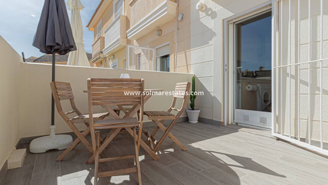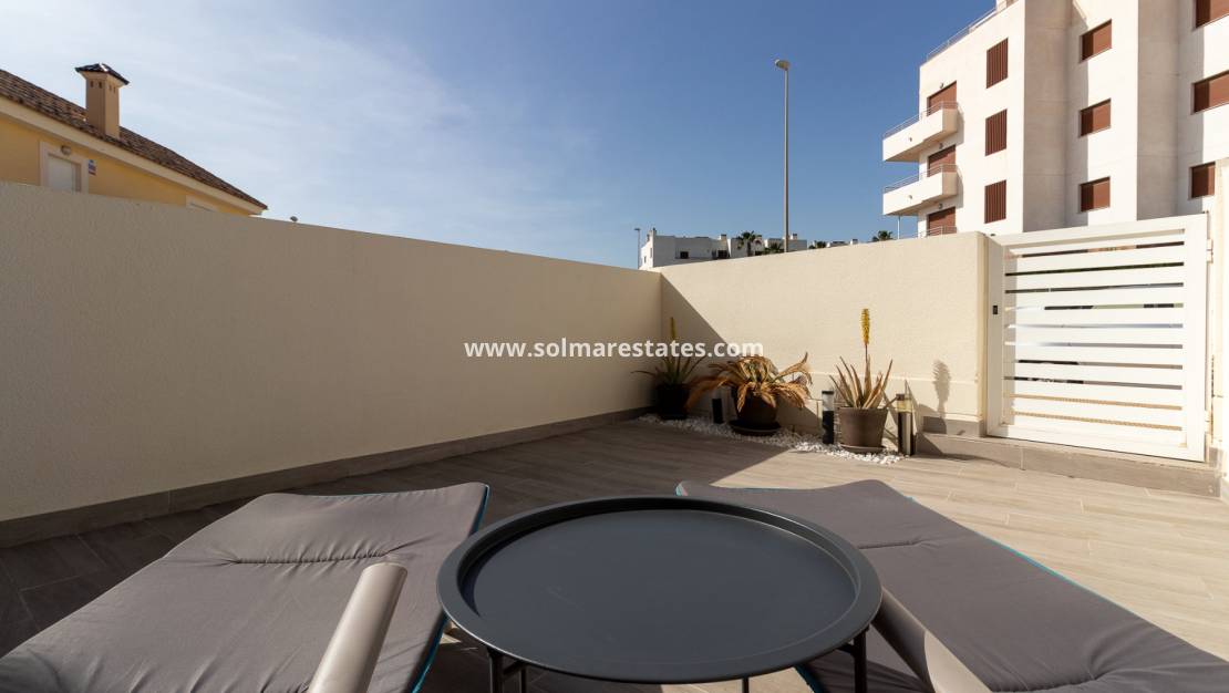 Dieses wunderschön präsentierte Reihenhaus mit Ausrichtung nach zwei Seiten befindet sich in perfekter Lage innerhalb einer sicheren und gepflegten Wohnanlage in Lomas de Cabo Roig.