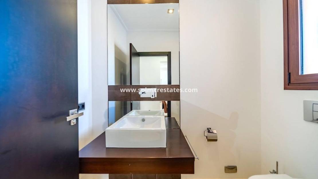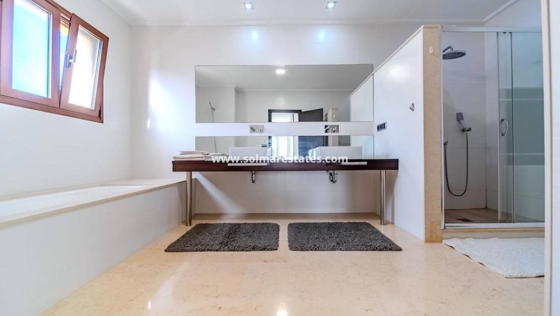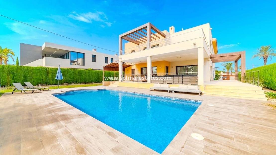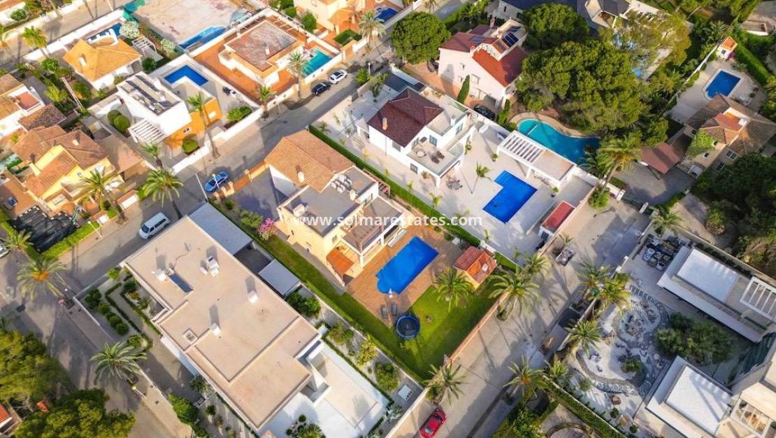 Cabo Roig, Villa de 1.095 metros de parcela y 477 m2 construidos de vivienda con 5 dormitorios, 5 baños, 2 aseos, salón, cocina y despensa.~Sala de juegos, sala de máquinas y sauna y 4 terrazas.~Piscina privada de 10x5, barbacoa.~Todas las viviendas están domotizadas, aire acondicionado, amuebladas a 300 metros de la playa~