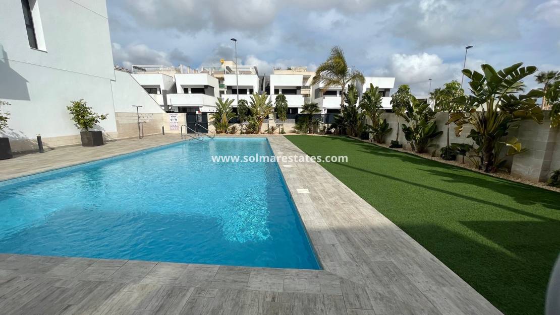 Delante del piso hay una bonita terraza con parking privado. En la parte trasera también hay una gran terraza, donde se puede disfrutar del aire libre con total privacidad. A través de la terraza se accede a la gran piscina comunitaria.