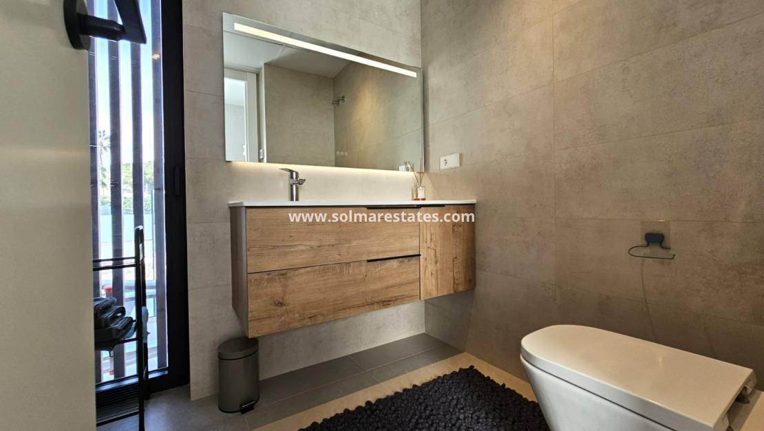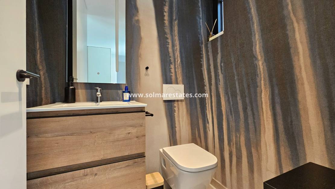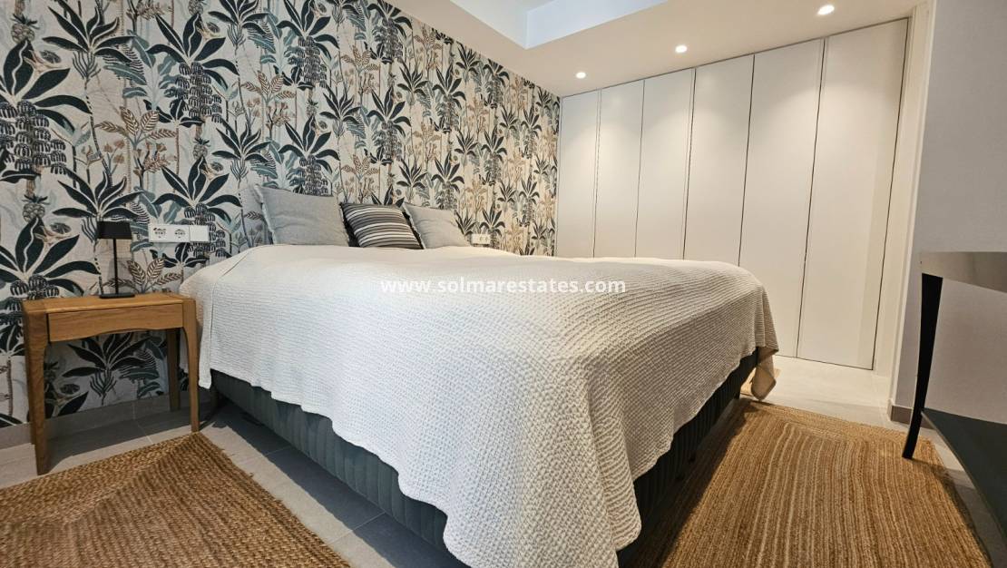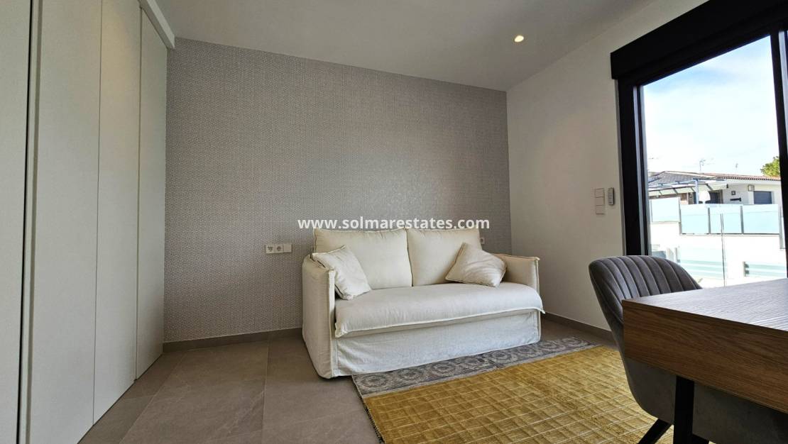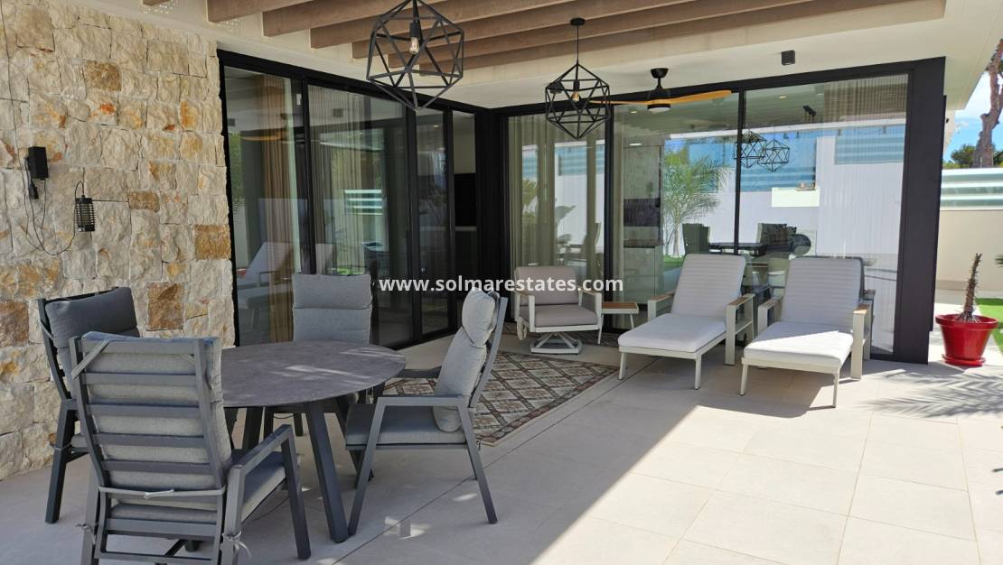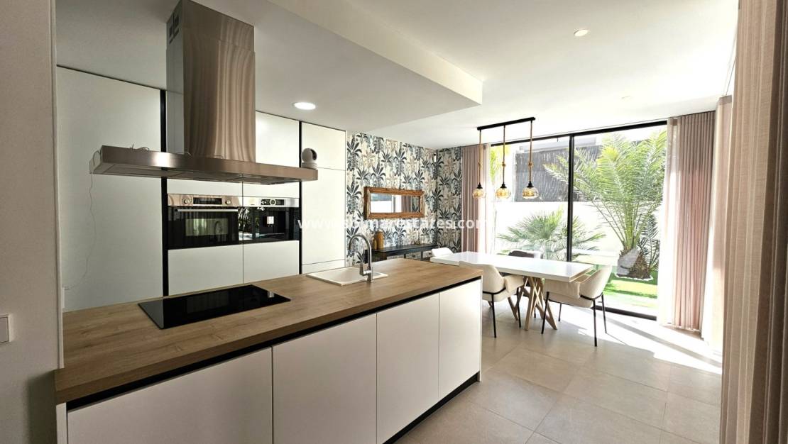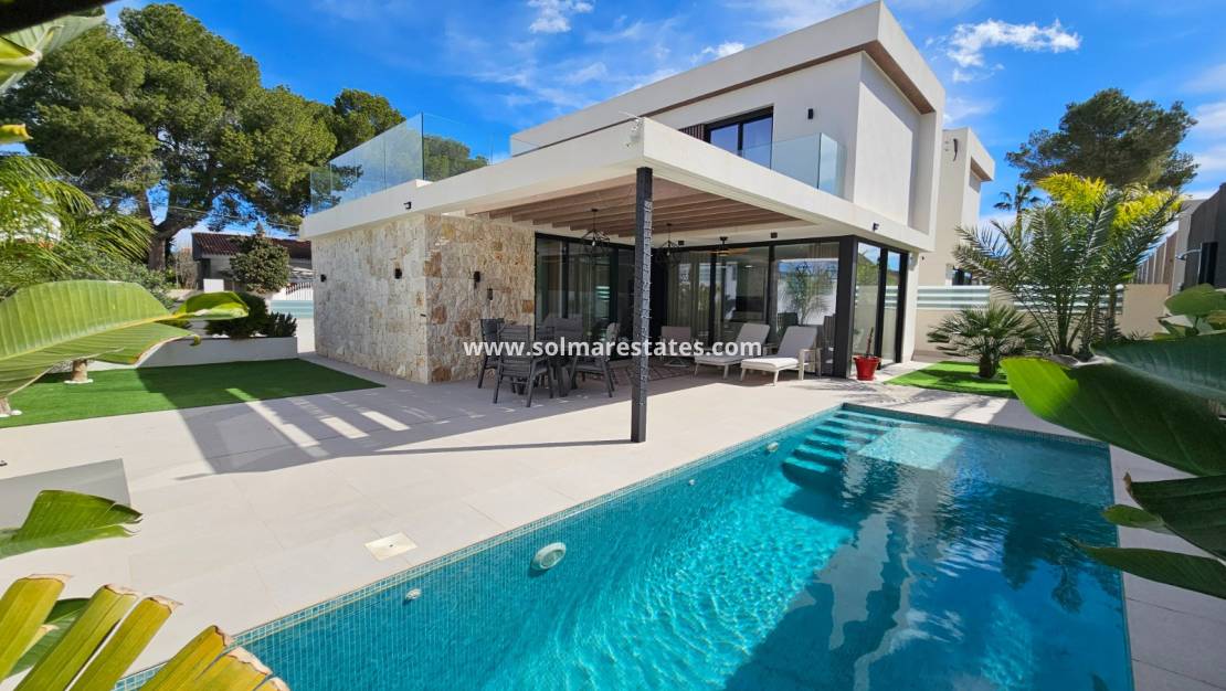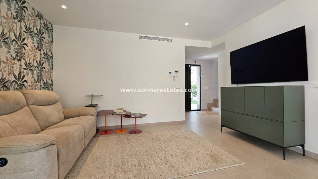 Prepárese para ser cautivado por esta impresionante propiedad, casi nueva, construida en 2022 y diseñada para la vida moderna y el disfrute sin esfuerzo. Con una distribución meticulosamente planificada, esta casa parcialmente amueblada ofrece 132 m² de espacio bellamente construido en una generosa parcela de 359 m², complementada con una extensa terraza de 62 m² perfecta para tomar el sol. Imagine relajarse junto a su piscina privada climatizada de 8x4 iluminada por luces LED, mientras disfruta de los beneficios ecológicos de los paneles solares que reducen drásticamente sus facturas de electricidad. Desde la puerta de estacionamiento automatizada y las persianas eléctricas hasta el sistema de seguridad de vanguardia (interior y exterior), no se ha pasado por alto ningún detalle. Con características como aire acondicionado por conductos, electrodomésticos Bosch y calefacción por suelo radiante en los baños, la comodidad y el lujo son primordiales. Disfrute de la privacidad de su césped artificial, enmarcado por muros de piedra natural, árboles frutales y frondosas palmeras, todo ello mantenido próspero por un sistema de riego automático. Esto es más que un hogar; ¡Es un estilo de vida que espera ser adoptado!