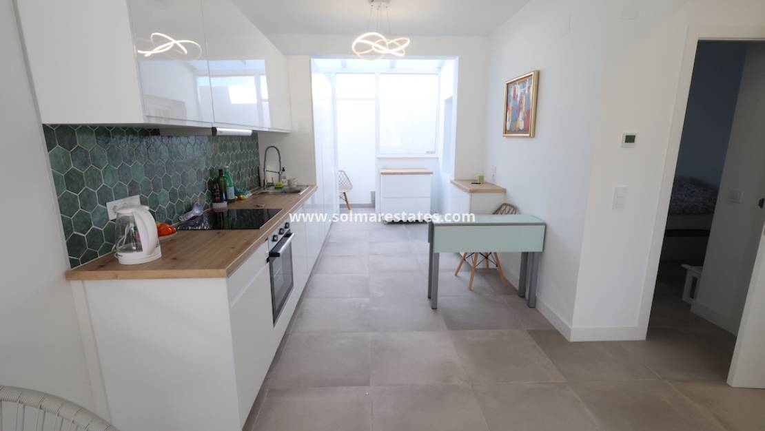 Salón / comedor con aire acondicionado frío y calor, ventilador de techo y puertas a la terraza acristalada, cocina abierta totalmente equipada, 2 dormitorios dobles, 1 baño con ducha, jardín delantero, solárium privado, trastero y mucho más.