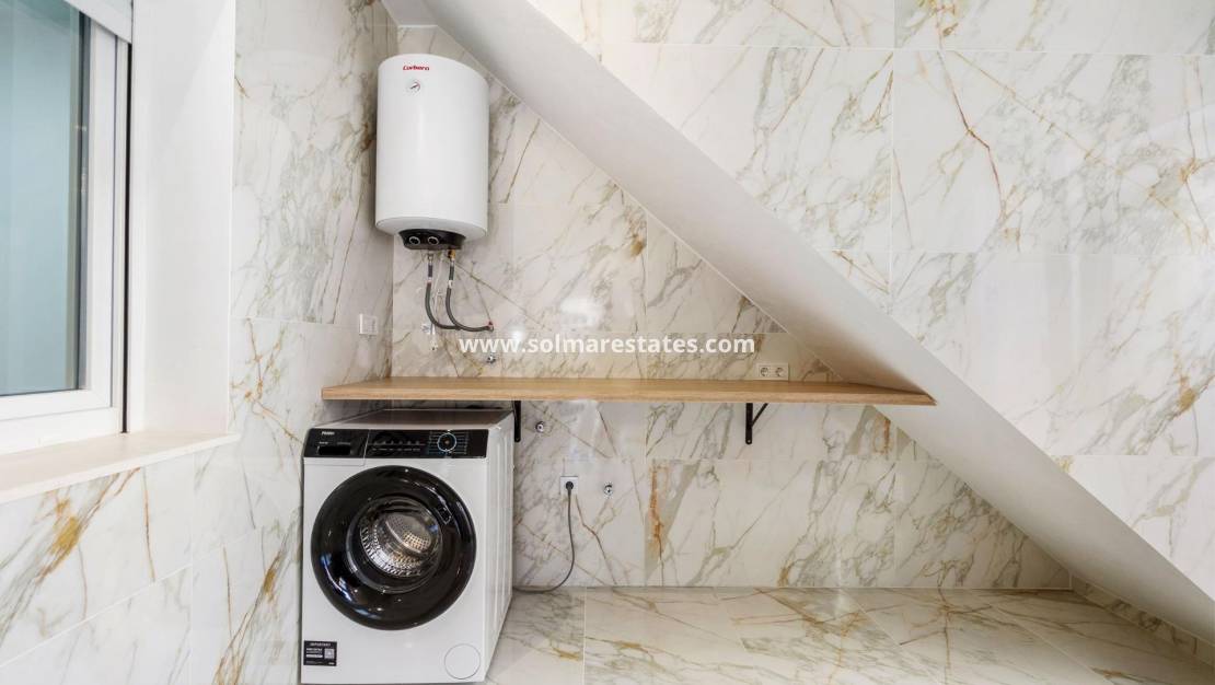 Chalet adosado recién reformado en El Chaparral, a poca distancia en coche de tiendas, bares, restaurantes, supermercados y del centro de Torrevieja. Se divide en dos viviendas con acceso independiente. En la planta baja encontramos una vivienda de 54 m², con 2 dormitorios, un baño, salón-comedor y cocina americana. En la primera planta, un apartamento con entrada independiente de unos 35 m², con 1 dormitorio doble, salón, cocina y baño propios, y una amplia terraza con vistas a los alrededores. La reforma integral se realizó recientemente con materiales de calidad y un diseño interior moderno. Calefacción por suelo radiante en los baños. Se vende con muebles y electrodomésticos a estrenar. Plaza de aparcamiento en la parcela. Este chalet ofrece una armoniosa combinación de comodidad y estilo.