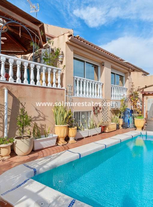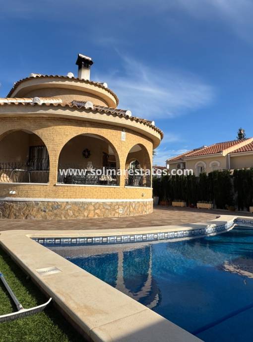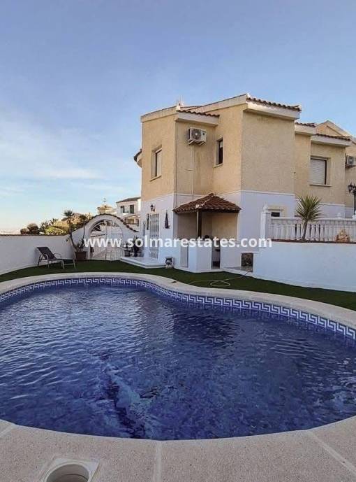Esta villa de tres dormitorios se encuentra en una amplia parcela y cuenta con una piscina de 8x4 m. La zona exterior está impecablemente cuidada con suelos de baldosas para un mantenimiento sencillo. La piscina está equipada con sus propios paneles solares, lo que permite climatizarla gratuitamente, garantizando así su disfrute durante todo el año.