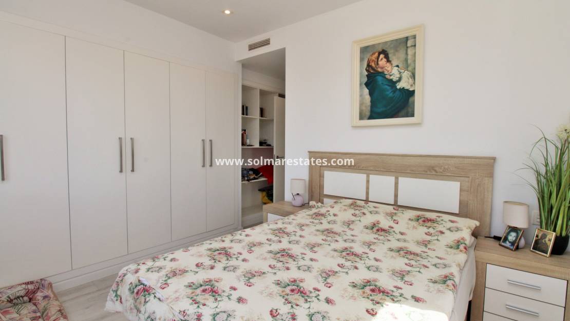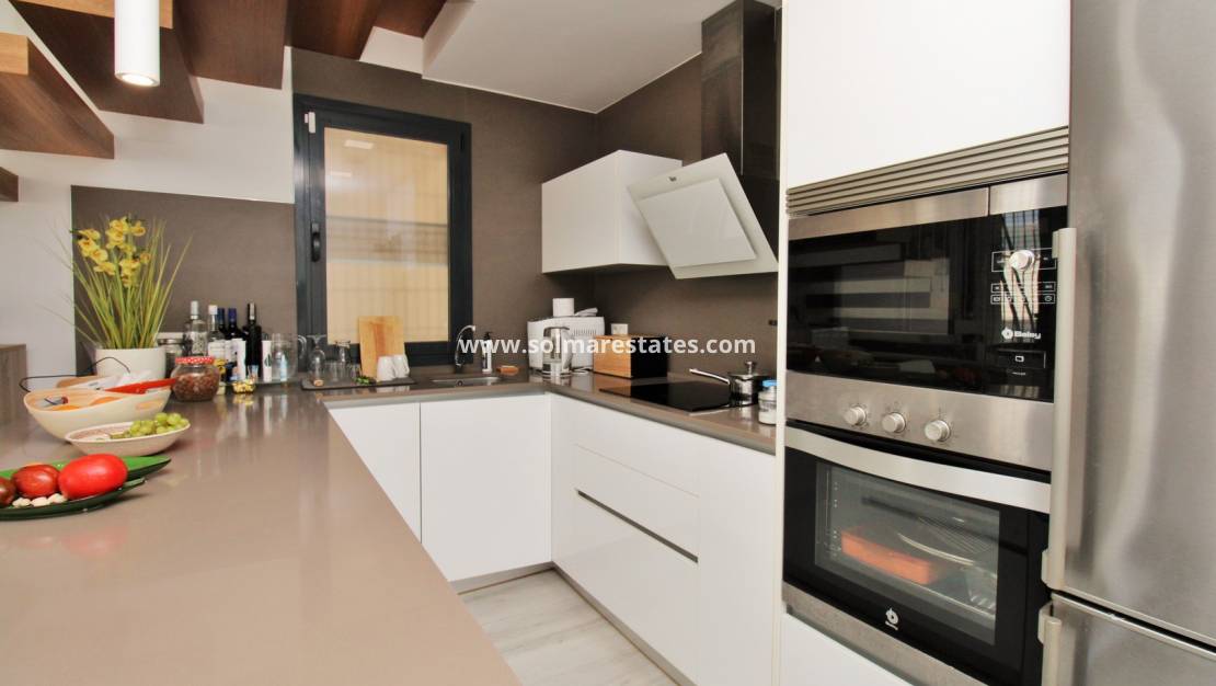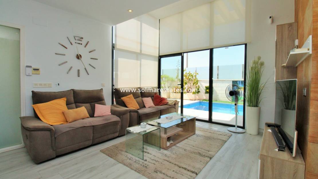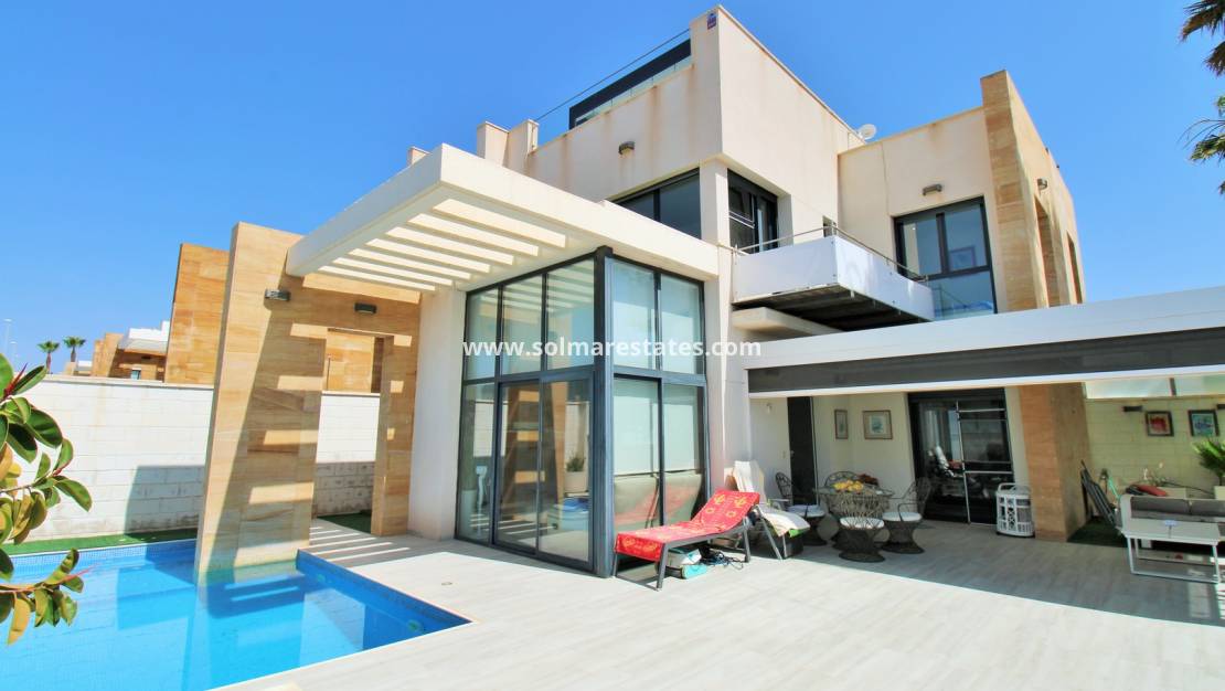Esta impresionante villa independiente de tres dormitorios y tres baños se encuentra en el muy deseado desarrollo Palm Beach II en Lomas de Cabo Roig , a solo 2 km de las hermosas playas con Bandera Azul de Aguamarina y La Glea (Campoamor) .