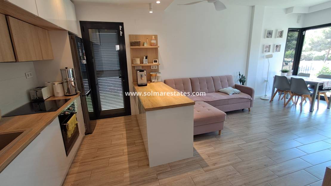 La villa cuenta con una piscina privada ubicada en un elegante jardín de fácil mantenimiento con césped artificial, un espacio ideal para relajarse, entretenerse o disfrutar del sol español. Un amplio solárium en la azotea ofrece aún más espacio para disfrutar del clima mediterráneo y disfrutar de las vistas panorámicas.