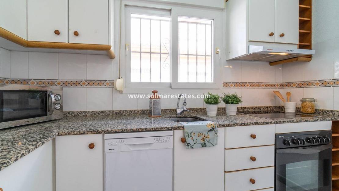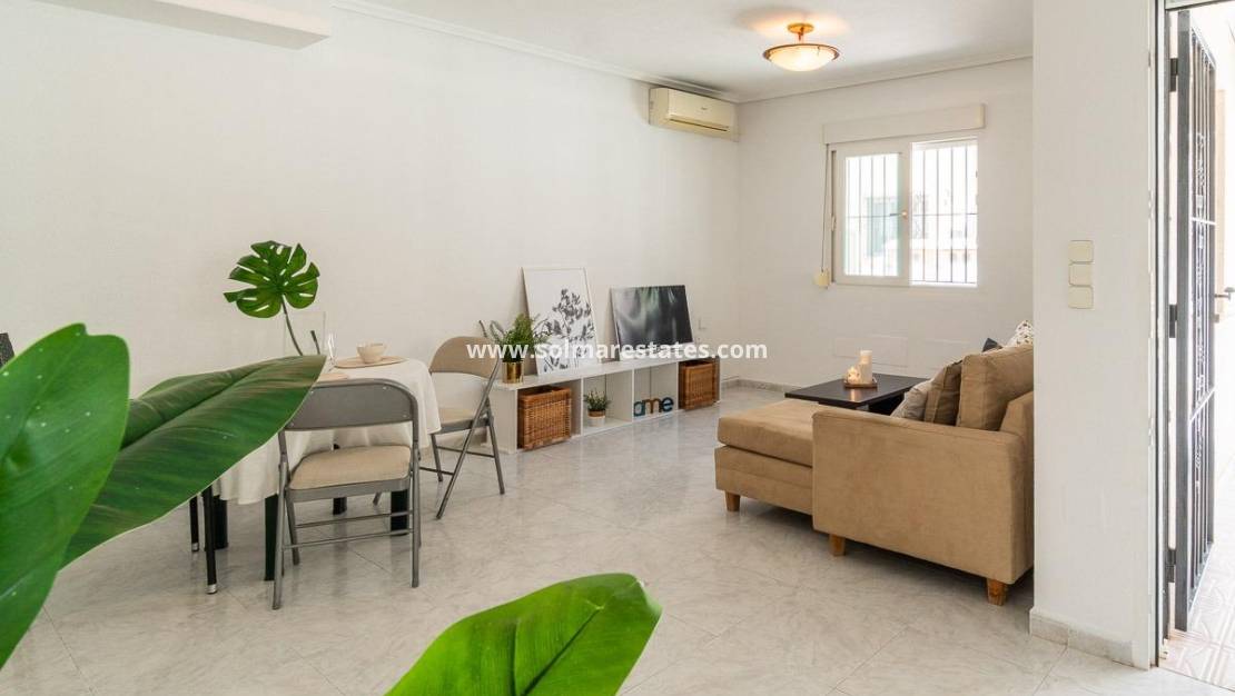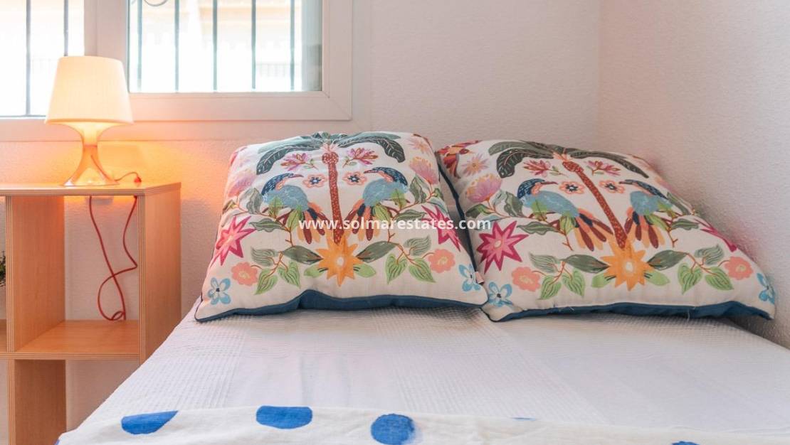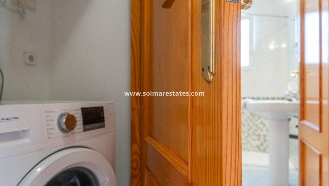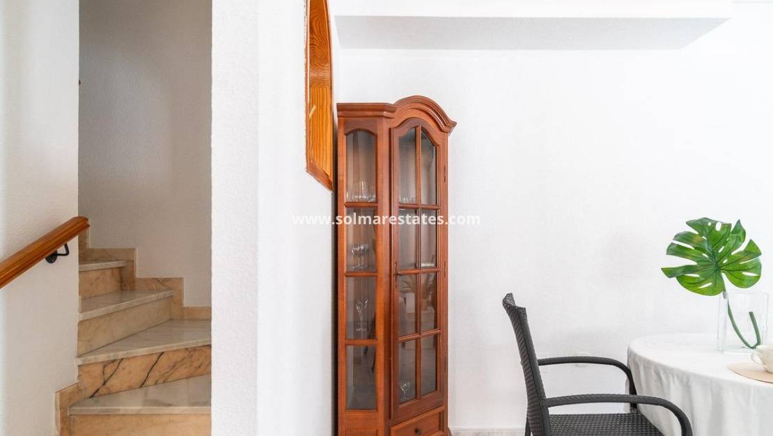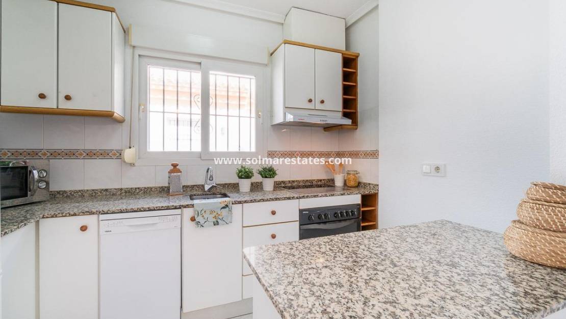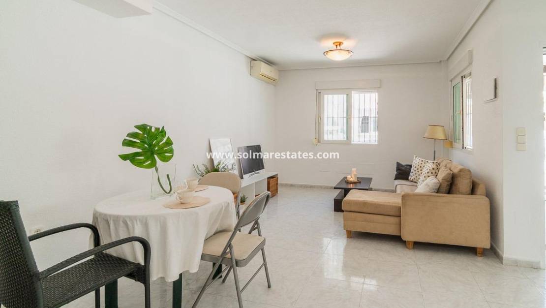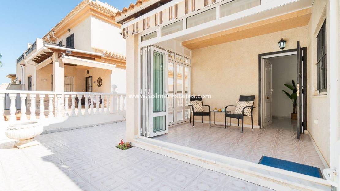 Espaciosa casa adosada con cuatro esquinas, en un complejo residencial con piscina comunitaria en el centro de Playa Flamenca. Muy cerca de zonas deportivas y de ocio, del centro comercial Zenia Boulevard y otras zonas comerciales, a un corto paseo de las playas de Playa Flamenca y de los colegios públicos locales, del mercado de los sábados, así como de bares y restaurantes. Sin embargo, en una tranquila urbanización cerrada con piscina y jardines comunitarios, calles privadas de uso exclusivo para residentes y plazas de aparcamiento a pie de casa para facilitar el acceso de su familia, maletas y otros artículos desde su vehículo a su hogar en tan solo unos pasos. La casa cuenta con una terraza esquinera con zona embaldosada y zonas ajardinadas, con espacio suficiente para una barbacoa, un rincón de lectura, una zona chill-out o cualquier otro uso que desee dar a sus más de 30 m². También cuenta con un trastero de aluminio para maletas, herramientas y más. El porche de entrada de la casa cuenta con un cerramiento de aluminio y cristal, ideal para usar como salón de invierno gracias a su inmejorable orientación sur-suroeste. Esto garantiza sol todo el año. En invierno, con el cerramiento mencionado, se puede disfrutar de una zona cálida que también calienta el resto de la casa. En verano, todas las ventanas de cristal se pueden abrir para dejar entrar el aire fresco. La casa cuenta con tres dormitorios, uno en la planta baja y un baño con ducha en la misma planta. Esto significa que si hay una persona mayor con movilidad reducida o con discapacidad, no tendrá que subir escaleras, lo que la convierte en una distribución muy conveniente para todo tipo de familias. La descripción comienza con el acceso a través de la terraza acristalada mencionada, a través de la entrada de seguridad, al salón-comedor en forma de L con grandes ventanales que maximizan el espacio y proporcionan abundante luz natural a toda la planta baja. El salón cuenta con espacio para un rincón de lectura, un rincón de televisión y un comedor, así como una cocina abierta con barra americana, equipada con armarios y electrodomésticos. En la misma planta baja se encuentra un baño con ducha para uso de toda la planta, así como un amplio trastero bajo la escalera para guardar todos los enseres del hogar que no cupieran en el citado trastero de la terraza exterior.~~En la primera planta se encuentran dos habitaciones, ambas con armarios empotrados, una de ellas con balcón de desayuno, y un baño completo, además de un lavadero con lavadora y termo eléctrico de 80 litros.~~En la azotea de la propiedad tenemos un solárium de 30 metros cuadrados con vistas despejadas y espacio para el esparcimiento, la lectura o simplemente disfrutar del sol y de las vistas despejadas.~~La propiedad acaba de ser pintada y decorada, y una vez amueblada se puede empezar a disfrutar de ella.~~Merece la pena una visita para ver las múltiples posibilidades de la propiedad, gracias a su soleada ubicación, su situación muy tranquila, fáciles instalaciones de aparcamiento y a que se encuentra en perfecto estado y está lista para entrar a vivir de inmediato.