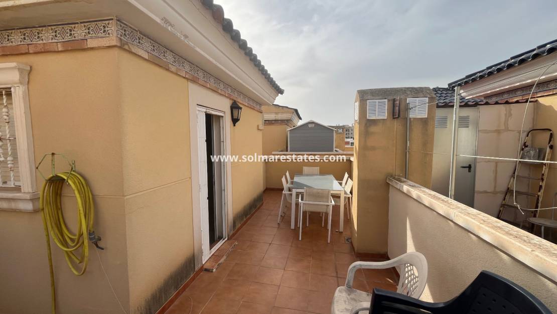 En la planta superior encontrará dos dormitorios más, ambos con aire acondicionado. El primero cuenta con dos camas individuales y armario empotrado, mientras que el dormitorio principal en esta planta también cuenta con dos camas individuales. En esta planta se comparte un baño familiar con bañera, inodoro y bidé. El acceso al espacioso solárium de la azotea ofrece un fantástico espacio privado para tomar el sol o entretenerse.