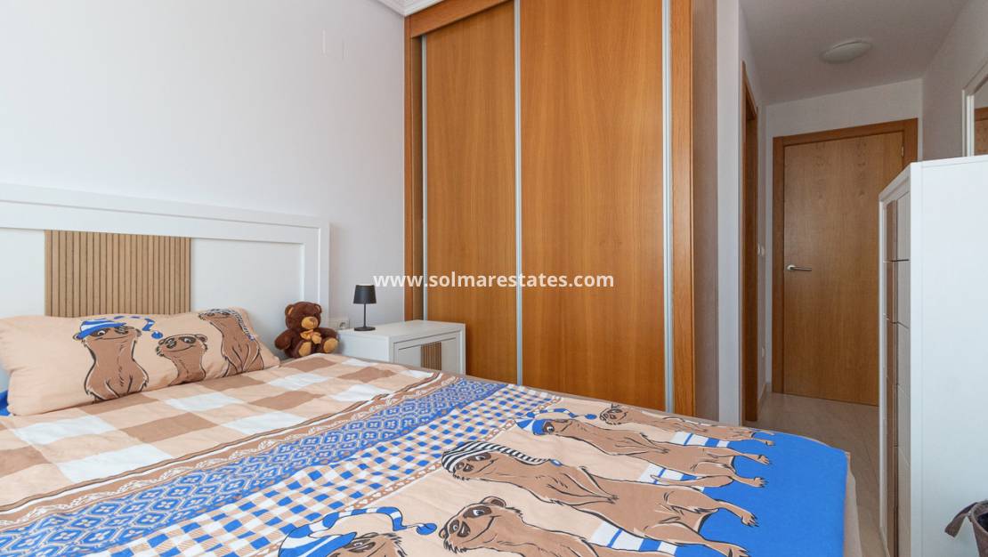 El apartamento cuenta con un dormitorio principal con baño en suite y ducha, un segundo dormitorio doble, un moderno baño adicional con ducha y una cocina independiente totalmente equipada con amplio espacio para comer. El luminoso salón da a una terraza-balcón privado con vistas a la piscina y los jardines comunitarios.