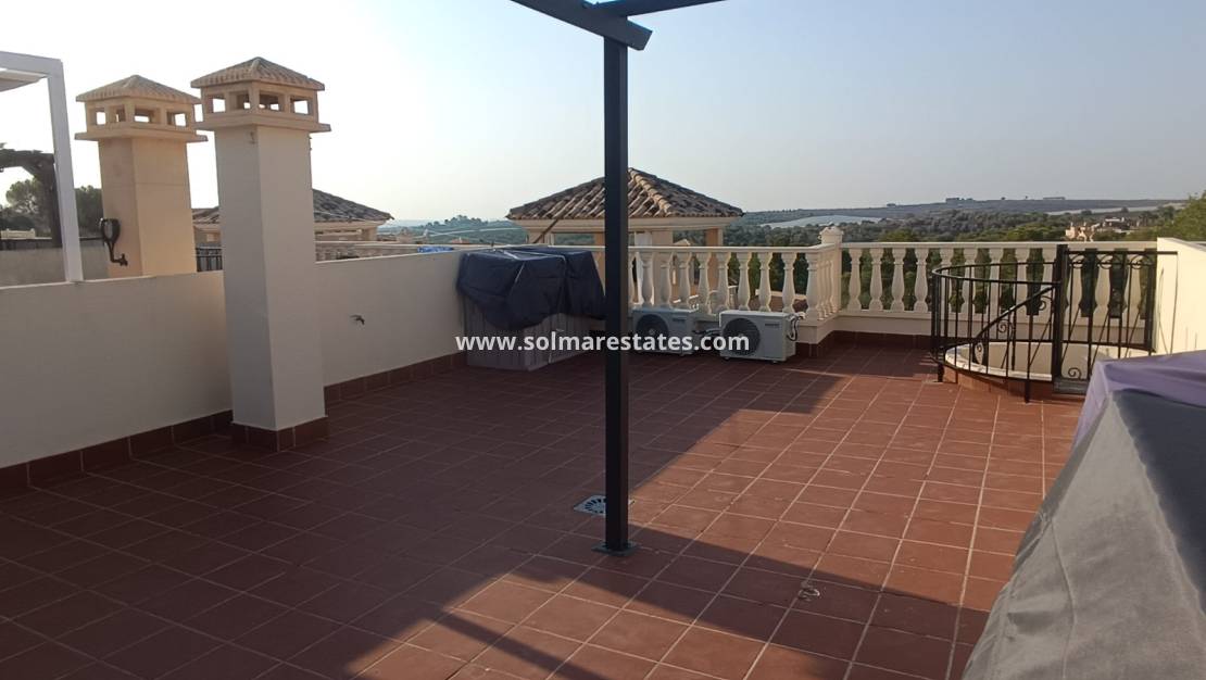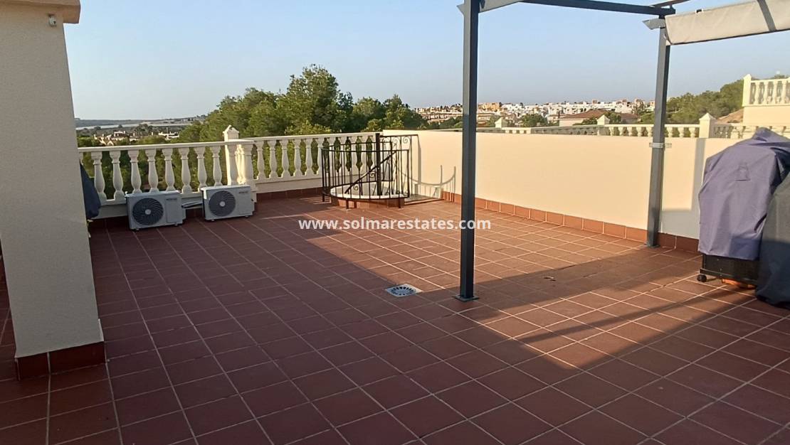 Una escalera de caracol conduce a un amplio solárium privado , con un cenador de nueva construcción para relajarse a la sombra en las tardes cálidas. Desde aquí, podrá disfrutar de vistas panorámicas a la piscina comunitaria y a la pista de tenis .